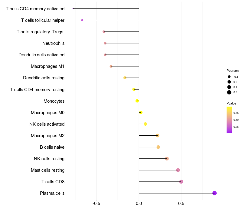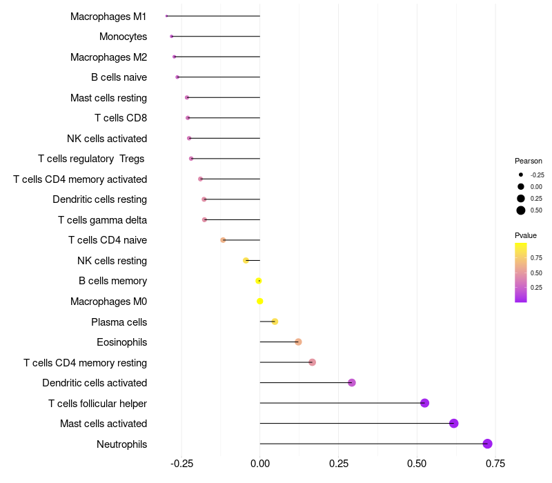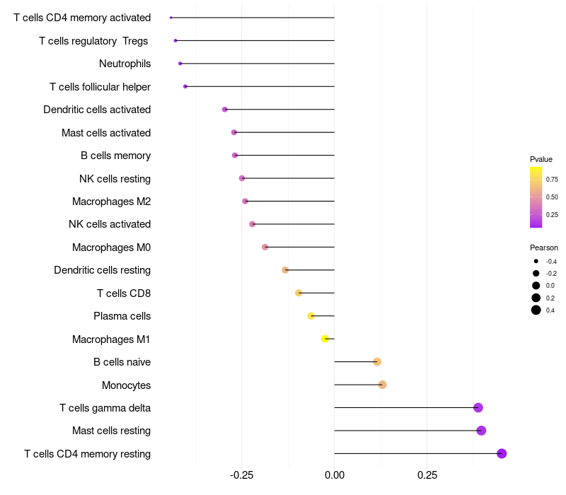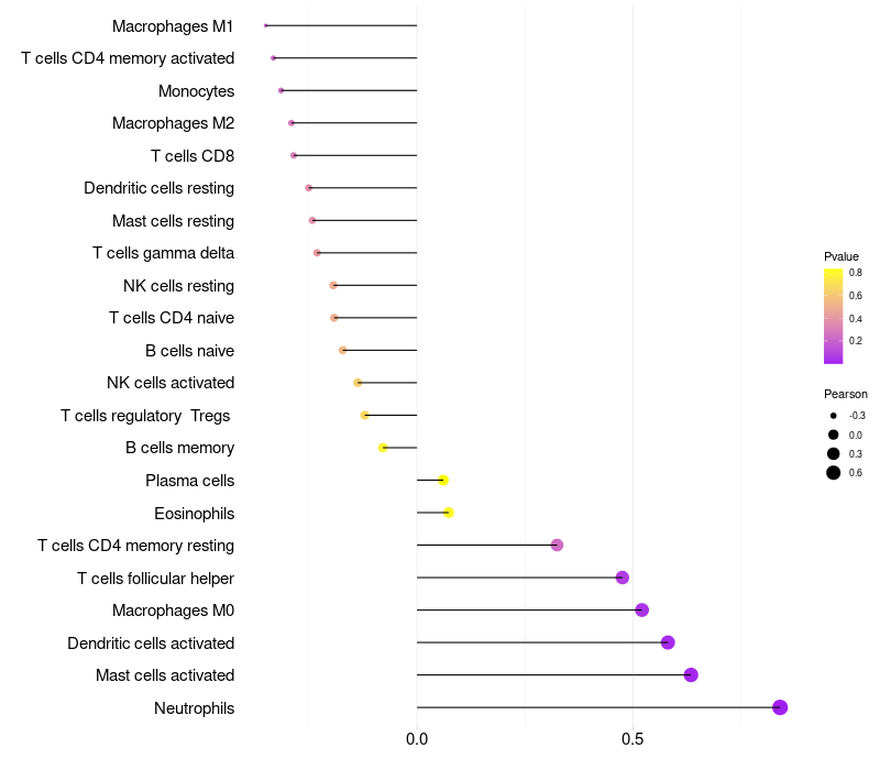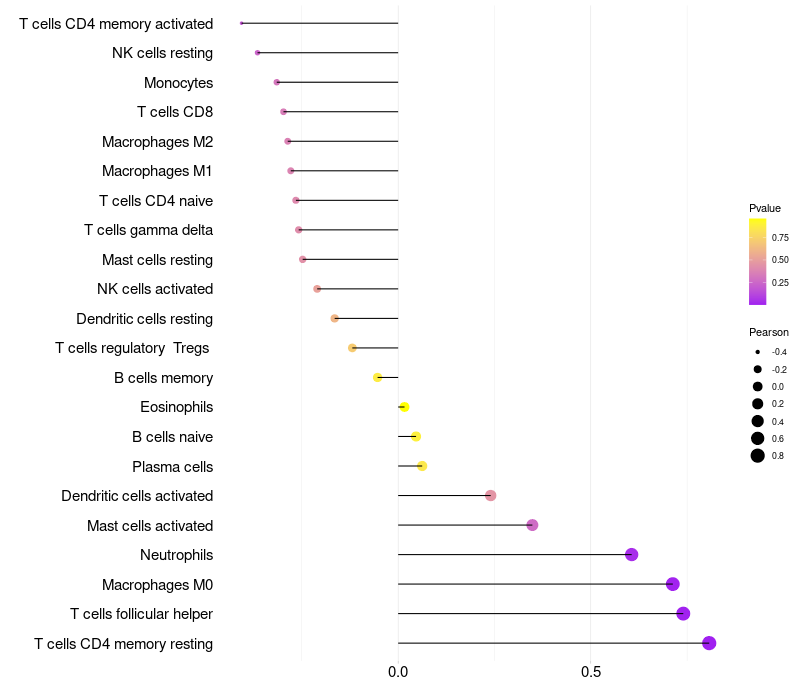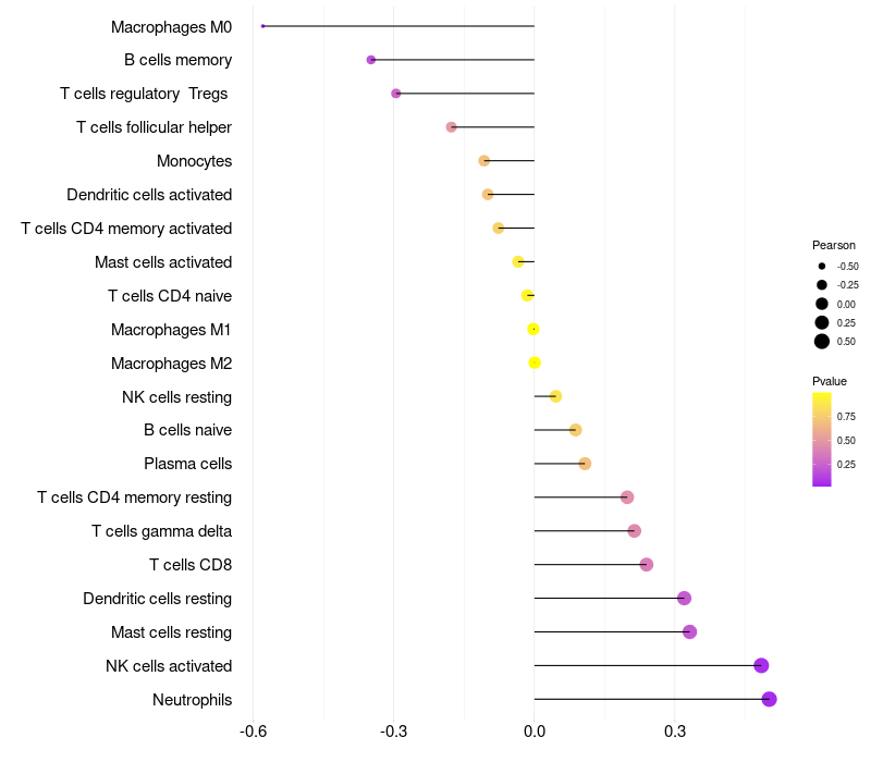 Lollipop of EDN3 expression and immune infiltrating cell level correlation result in HPV+ samples