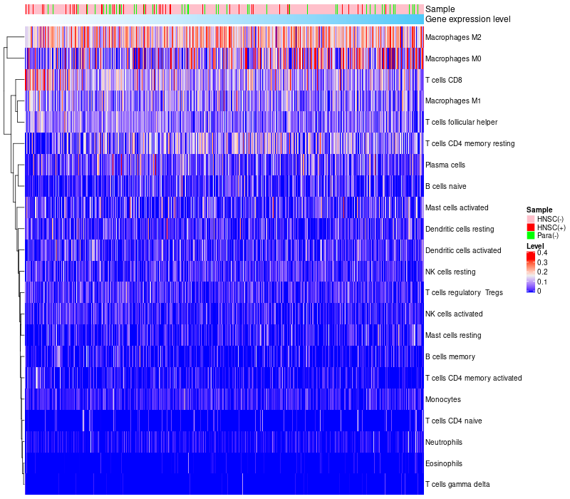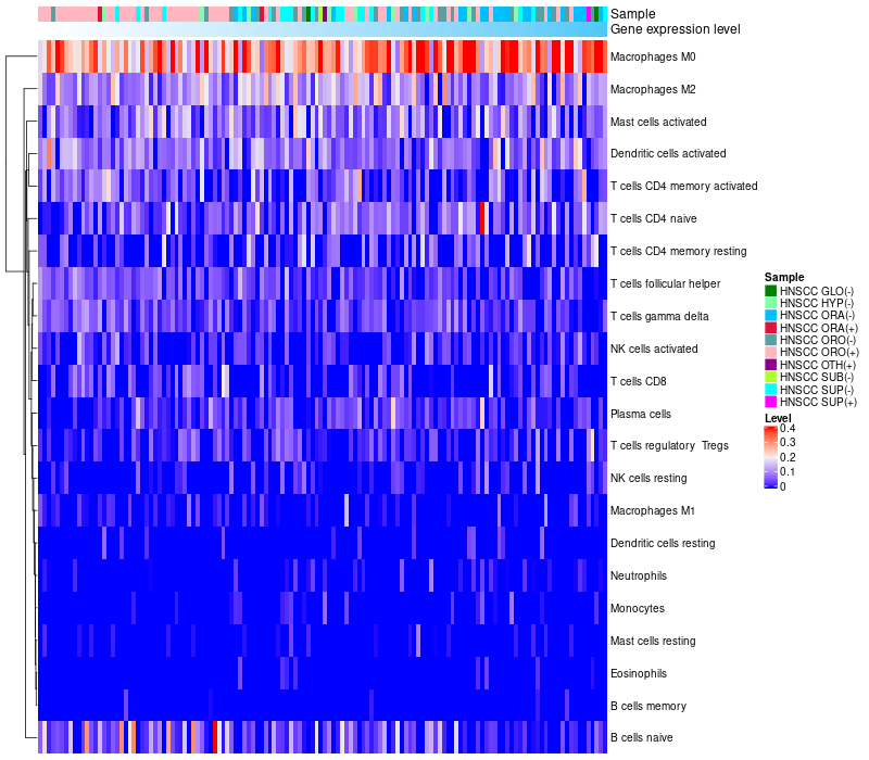 • Left: Heatmap of target gene expression and the level of various types of immune cells (cell type fractions) in all samples based on CIBERSORT method.
