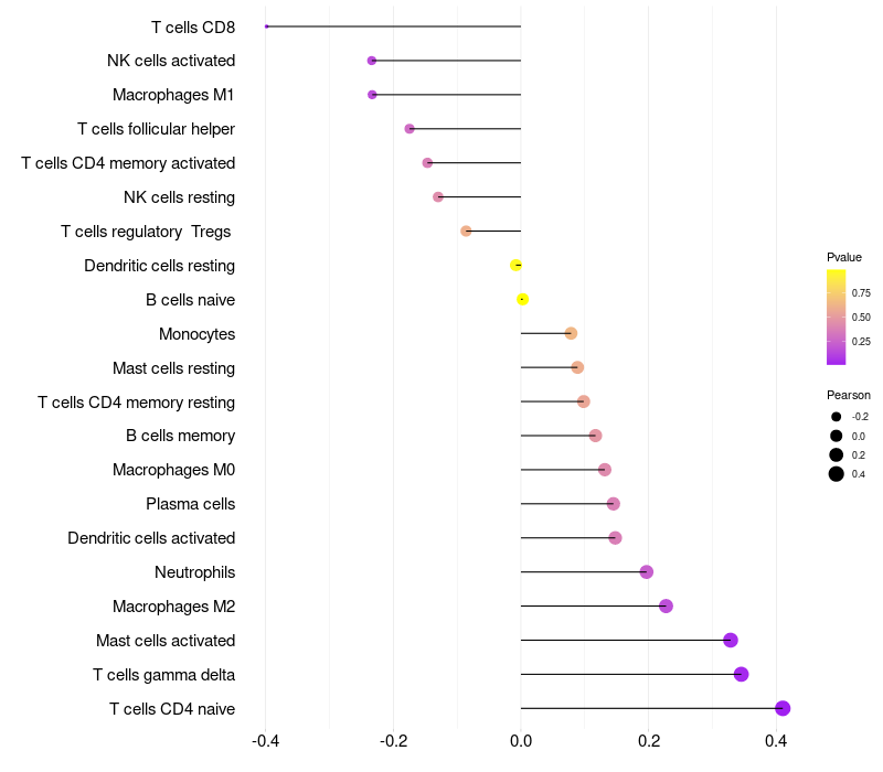 • Right: Correlation of target gene expression and the level of various types of immune cells in virus positive samples (Pearson Correlation Coefficient).