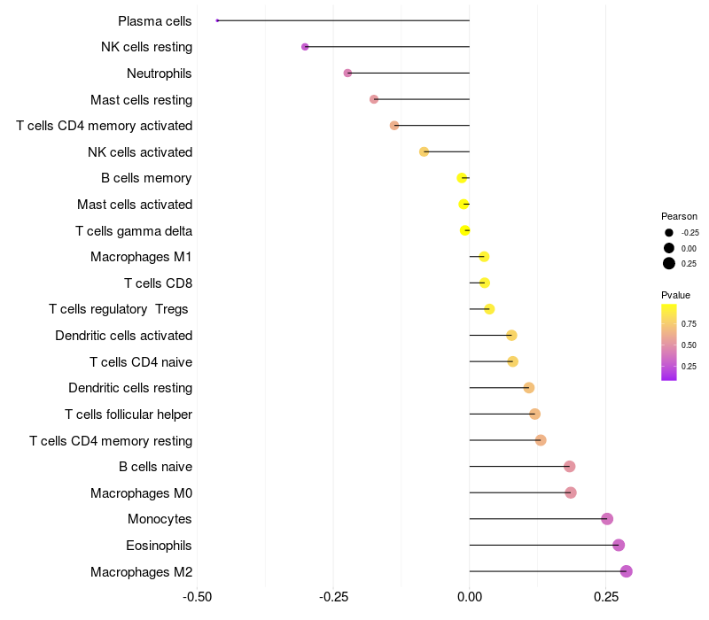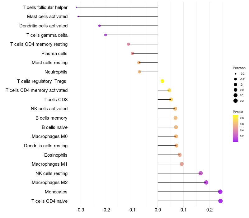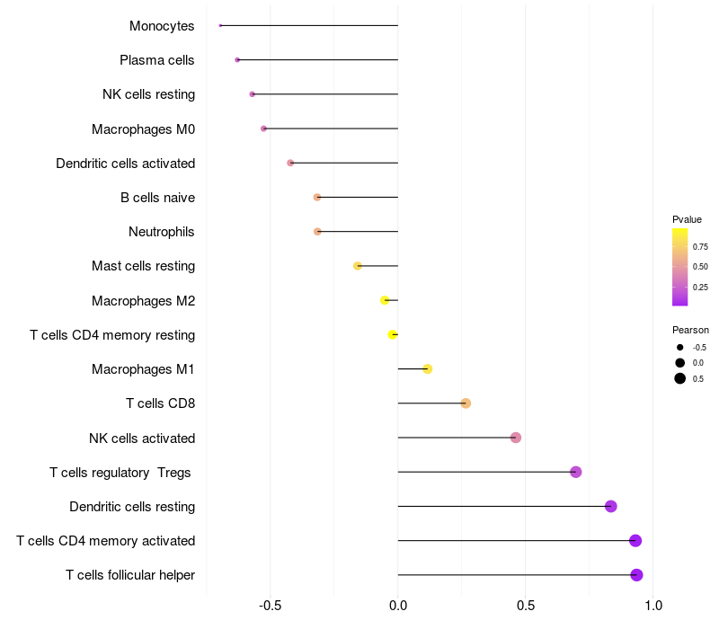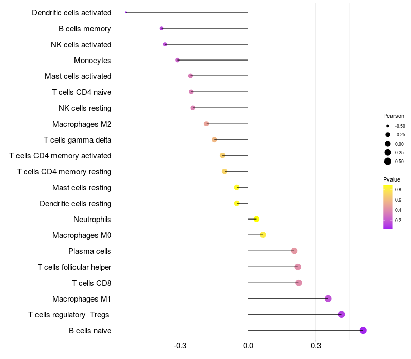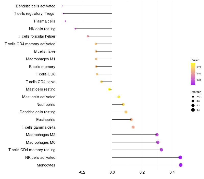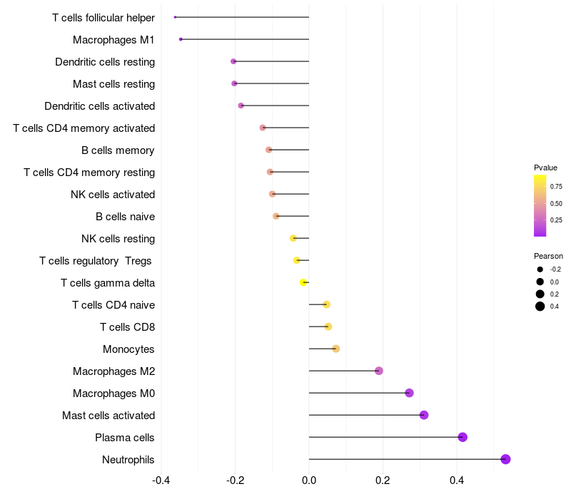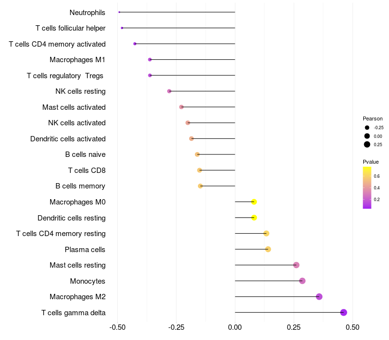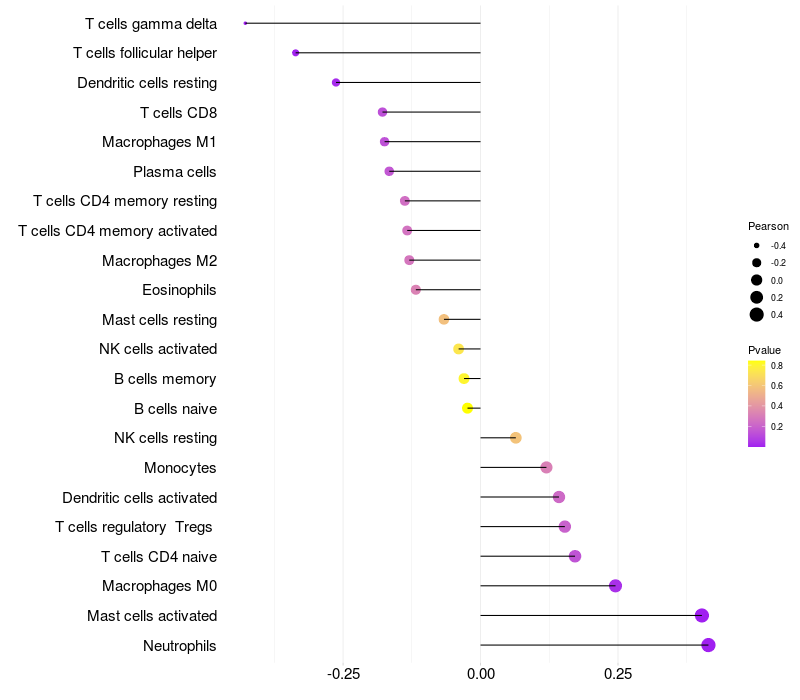 Lollipop of EGFL7 expression and immune infiltrating cell level correlation result in HPV+ samples