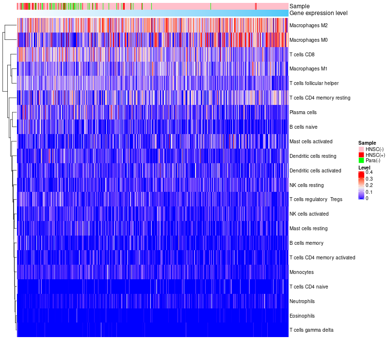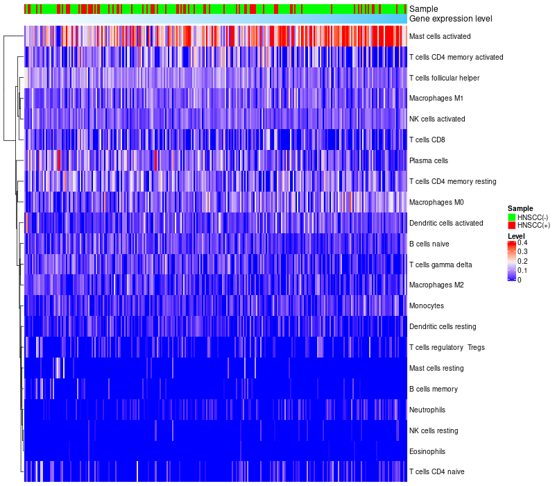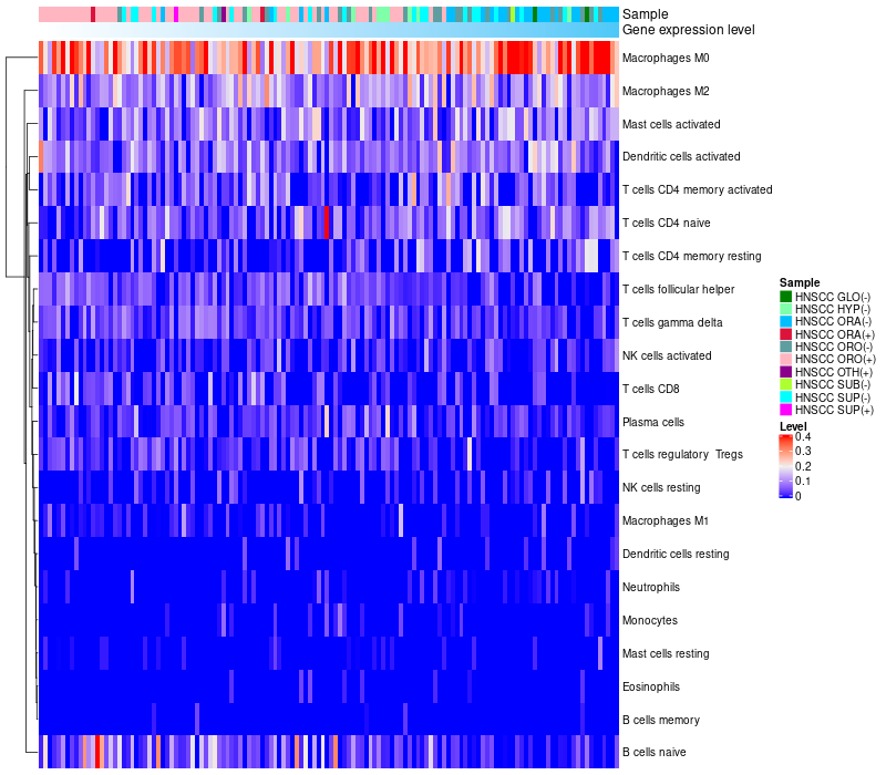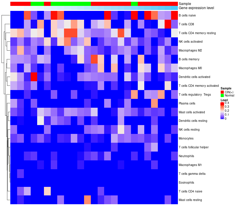 • Left: Heatmap of target gene expression and the level of various types of immune cells (cell type fractions) in all samples based on CIBERSORT method.