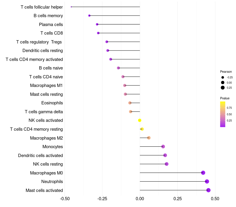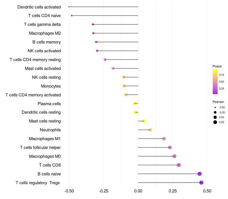 • Right: Correlation of target gene expression and the level of various types of immune cells in virus positive samples (Pearson Correlation Coefficient).