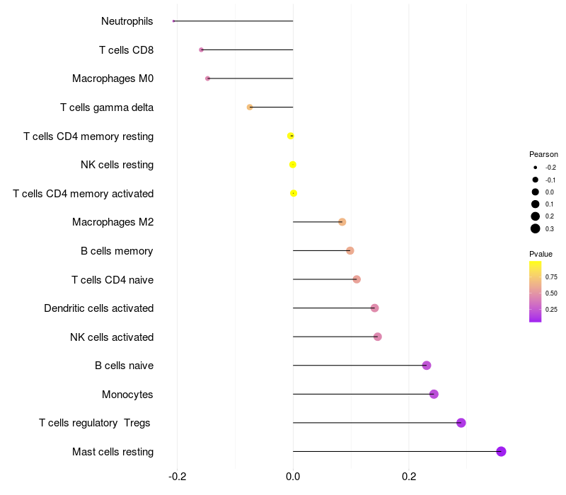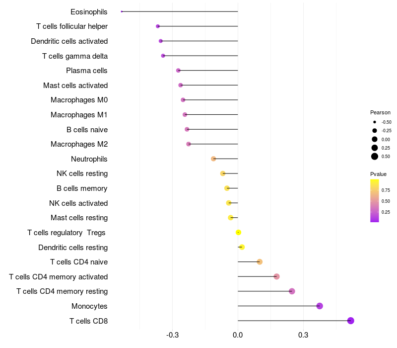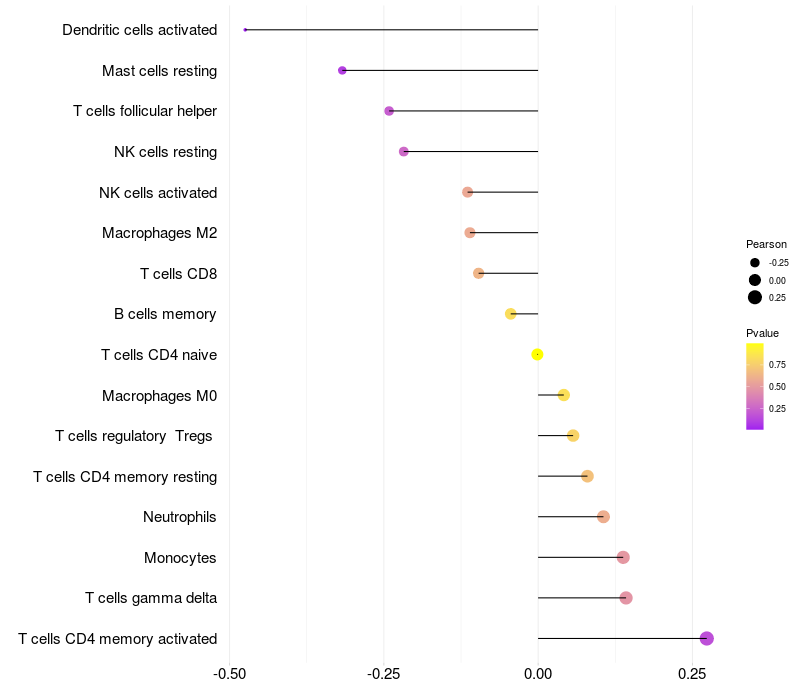Lollipop of EHD3 expression and immune infiltrating cell level correlation result in HTLV1+ samples