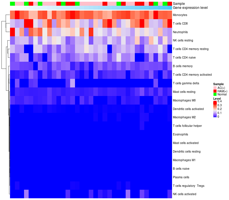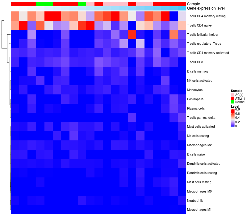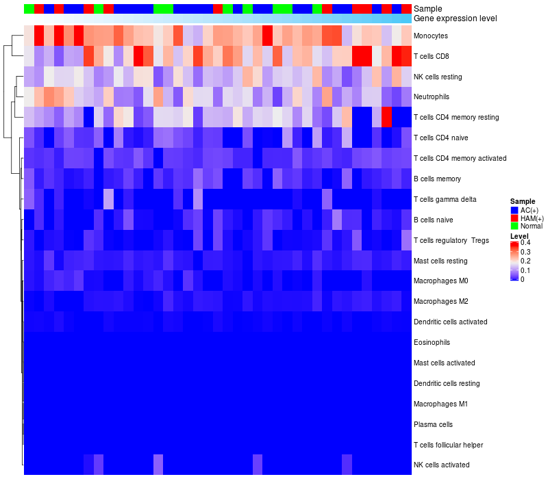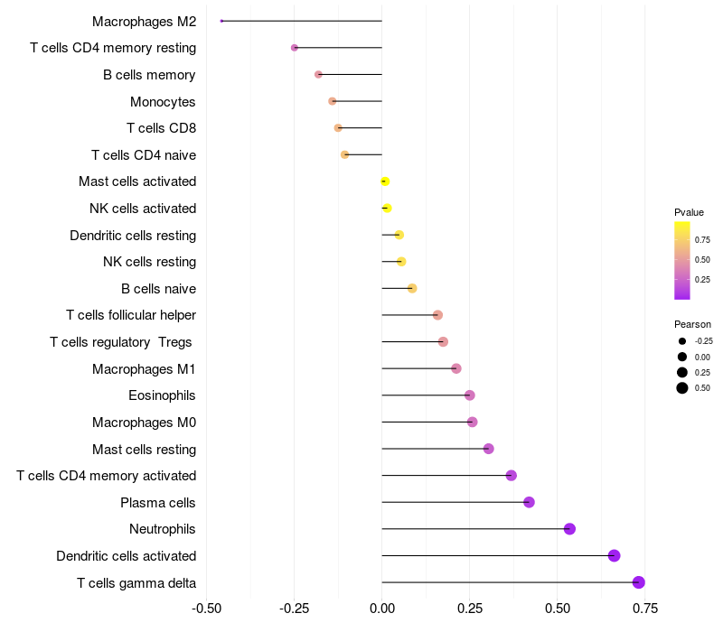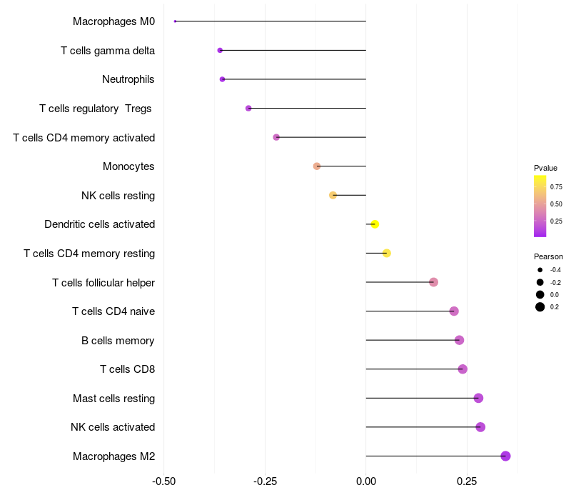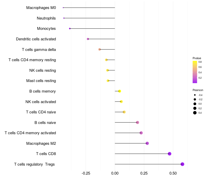 Lollipop of EIF2S1 expression and immune infiltrating cell level correlation result in HTLV1+ samples