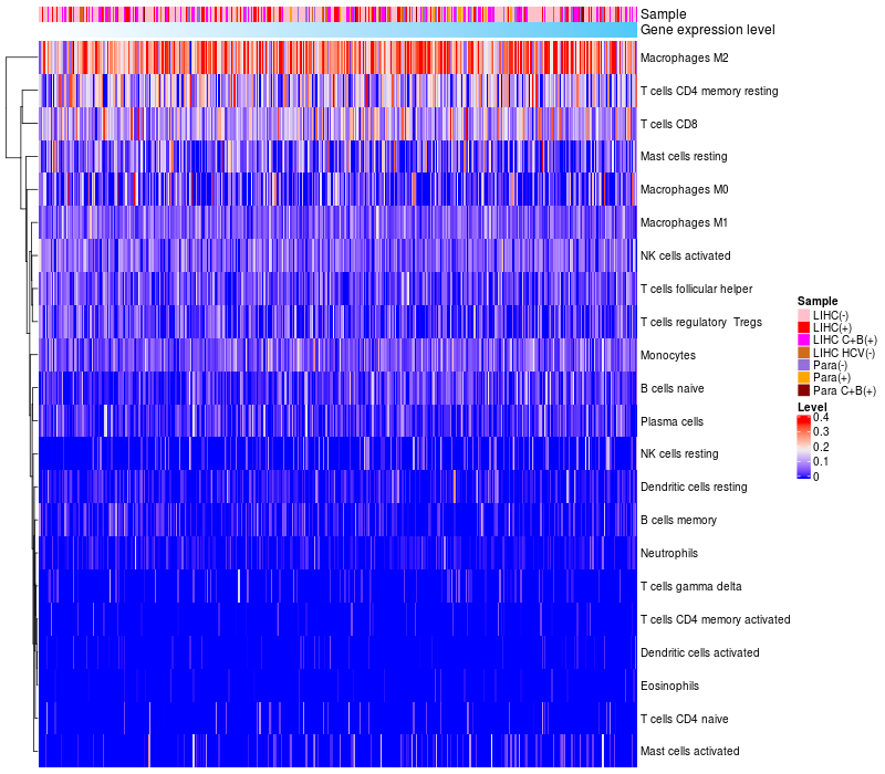 Liver hepatocellular carcinoma HCV (HBV+)(86), Liver hepatocellular carcinoma HCV (HBV-)(19), Liver hepatocellular carcinoma (HBV+)(209), Liver hepatocellular carcinoma (HBV+)(60), Paracancerous HCV (HBV+)(4), Paracancerous (HBV-)(28), Paracancerous (HBV+)(18) |