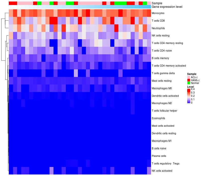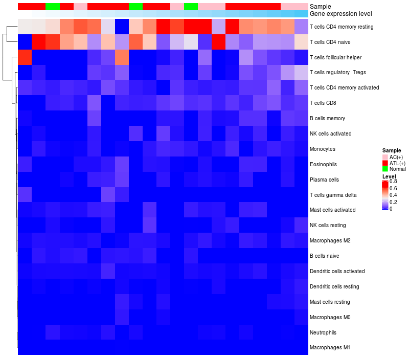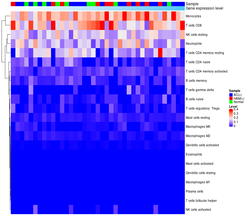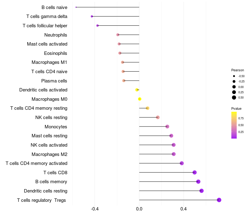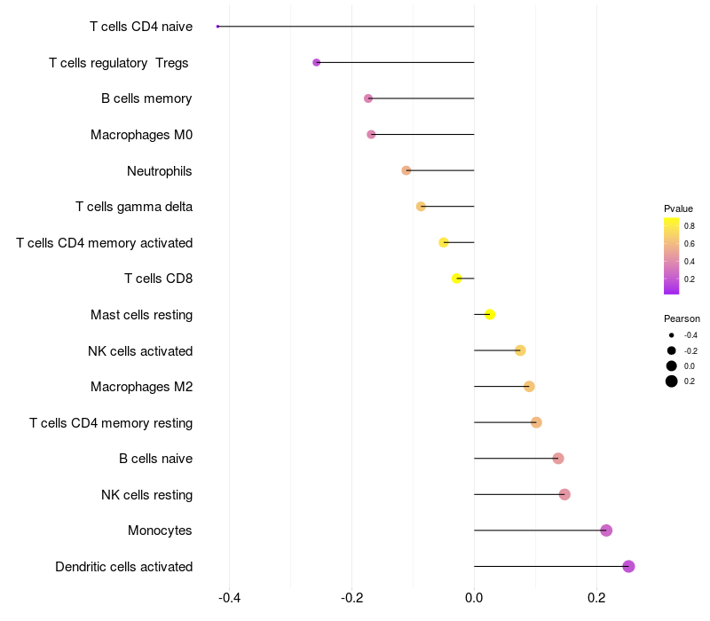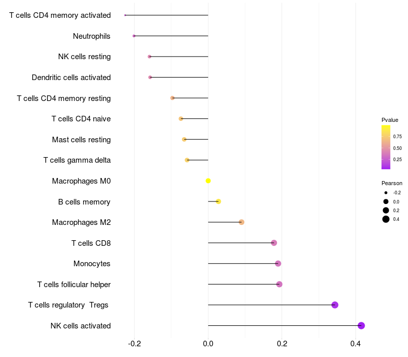 Lollipop of EIF4EBP1 expression and immune infiltrating cell level correlation result in HTLV1+ samples