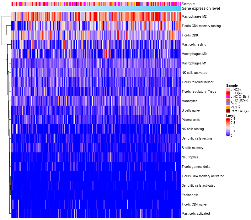 Liver hepatocellular carcinoma HCV (HBV+)(86), Liver hepatocellular carcinoma HCV (HBV-)(19), Liver hepatocellular carcinoma (HBV+)(209), Liver hepatocellular carcinoma (HBV+)(60), Paracancerous HCV (HBV+)(4), Paracancerous (HBV-)(28), Paracancerous (HBV+)(18) |