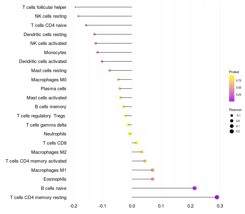 Lollipop of ELK3 expression and immune infiltrating cell level correlation result in HBV+ samples