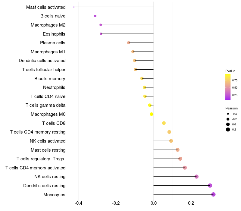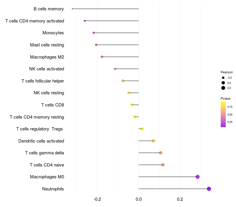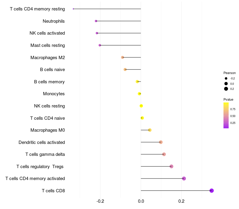 Lollipop of ELSPBP1 expression and immune infiltrating cell level correlation result in HTLV1+ samples