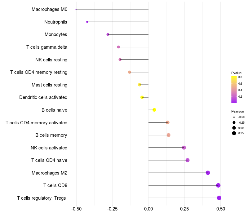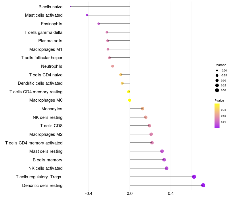 Lollipop of EML3 expression and immune infiltrating cell level correlation result in HTLV1+ samples