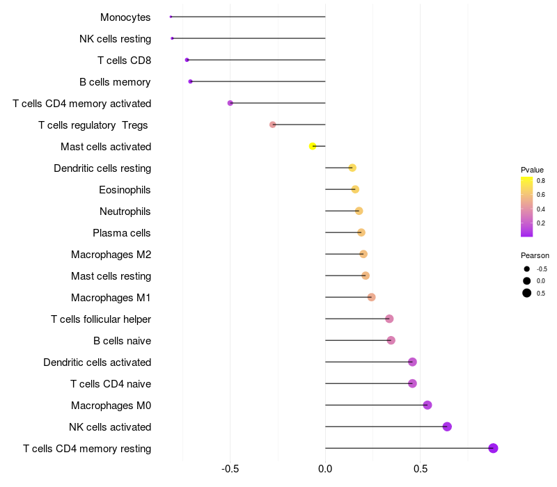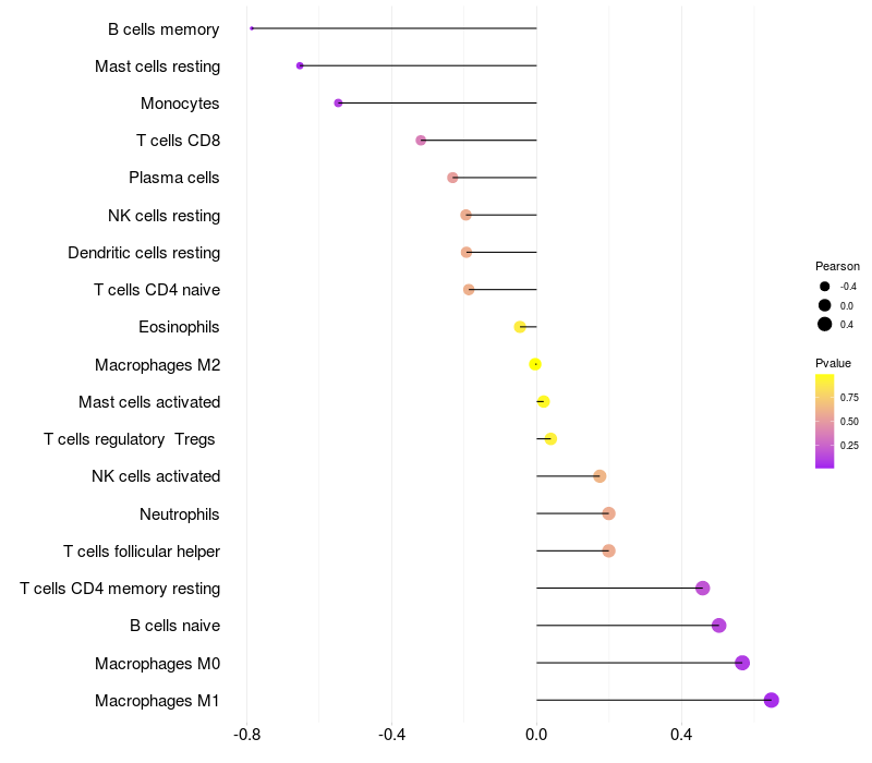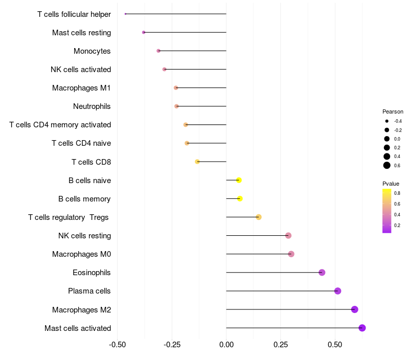 Lollipop of EMP2 expression and immune infiltrating cell level correlation result in HBV+ Liver cirrhosis samples