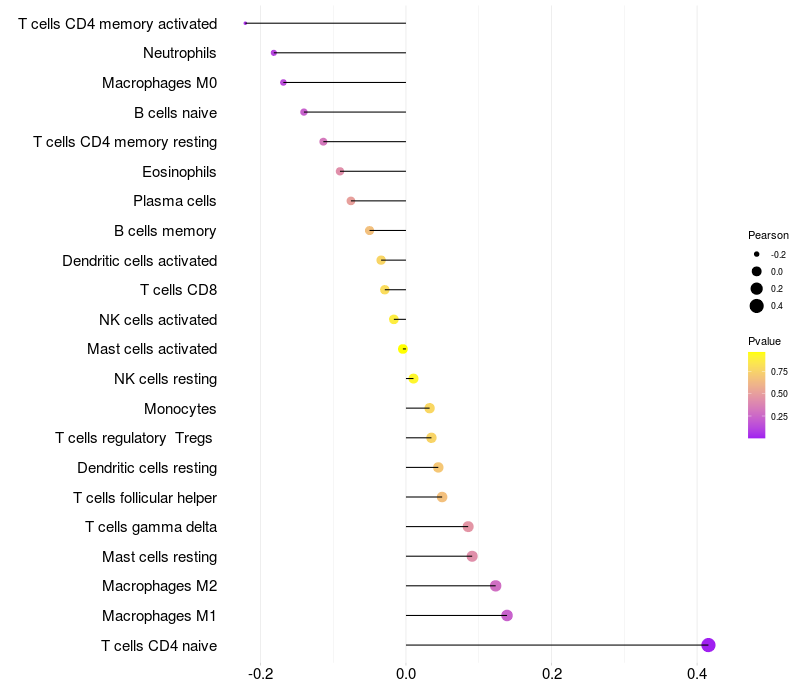 Lollipop of EMP2 expression and immune infiltrating cell level correlation result in HBV+ Chronic HBV (CHB) infection samples