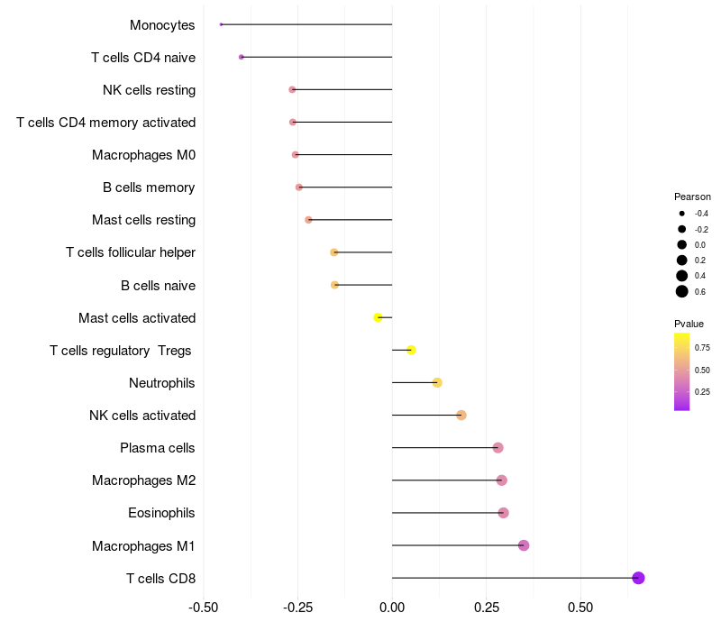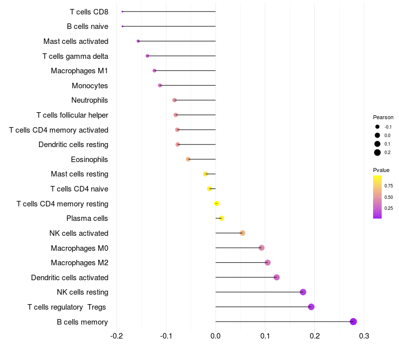 Lollipop of EMX1 expression and immune infiltrating cell level correlation result in HBV+ Chronic HBV (CHB) infection samples