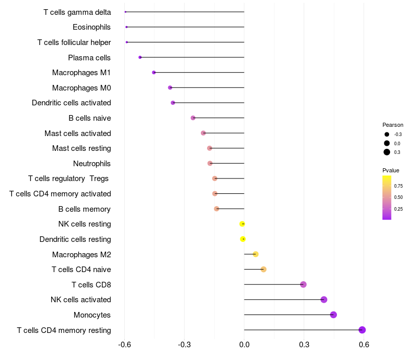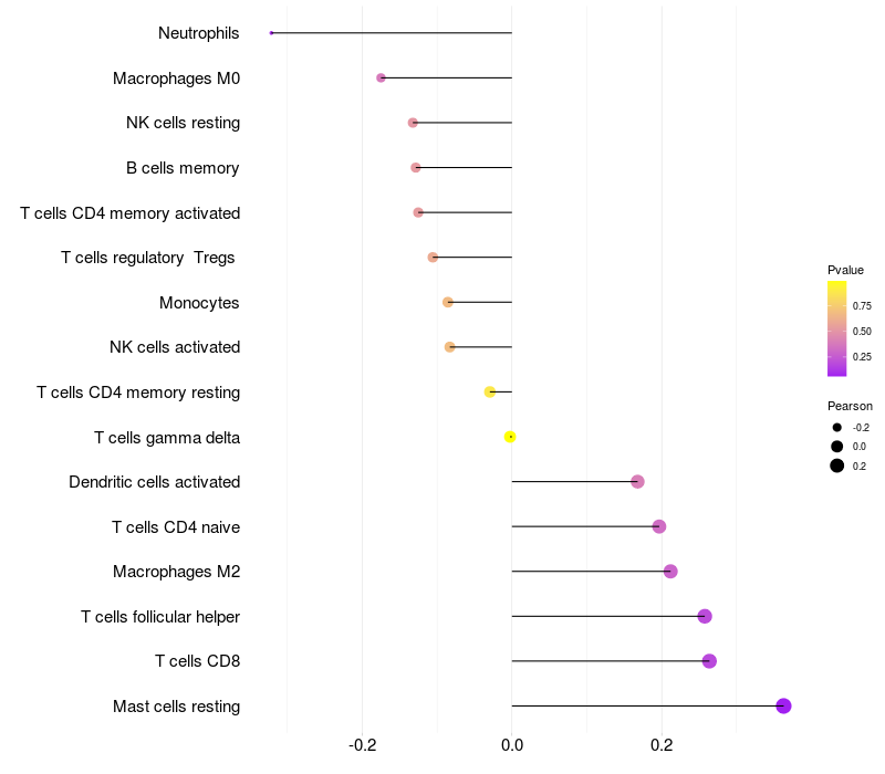 Lollipop of ENO2 expression and immune infiltrating cell level correlation result in HTLV1+ samples
