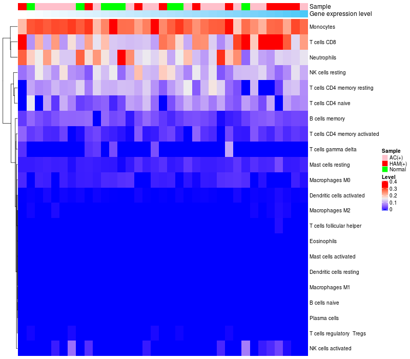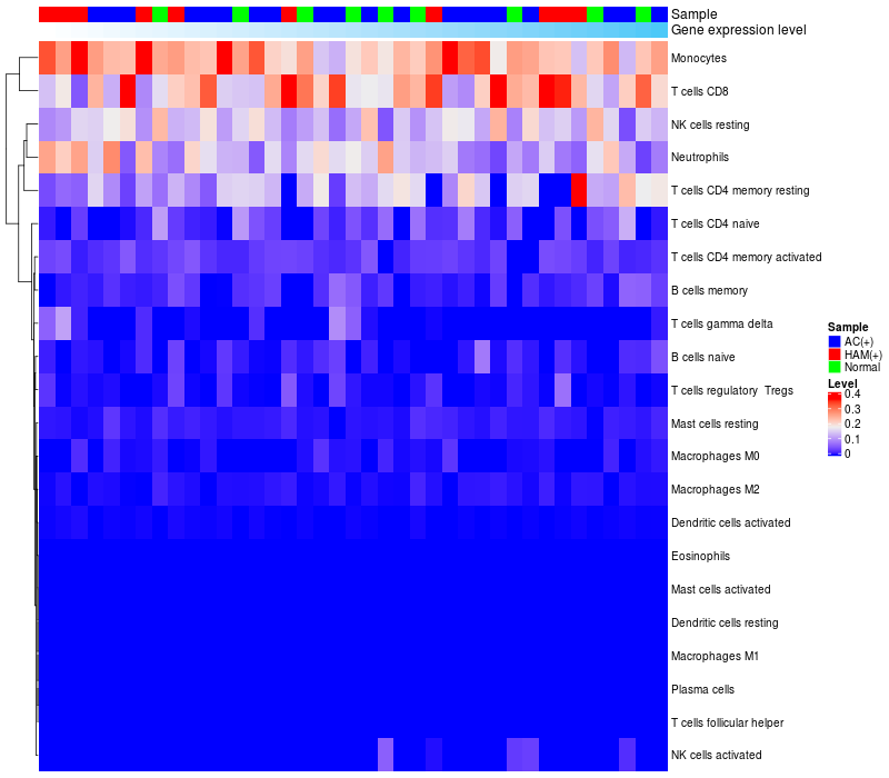 Normal (8), Asymptomatic carriers (HTLV1+)(17), HTLV-1-associated myelopathy (HTLV1+)(10) |
