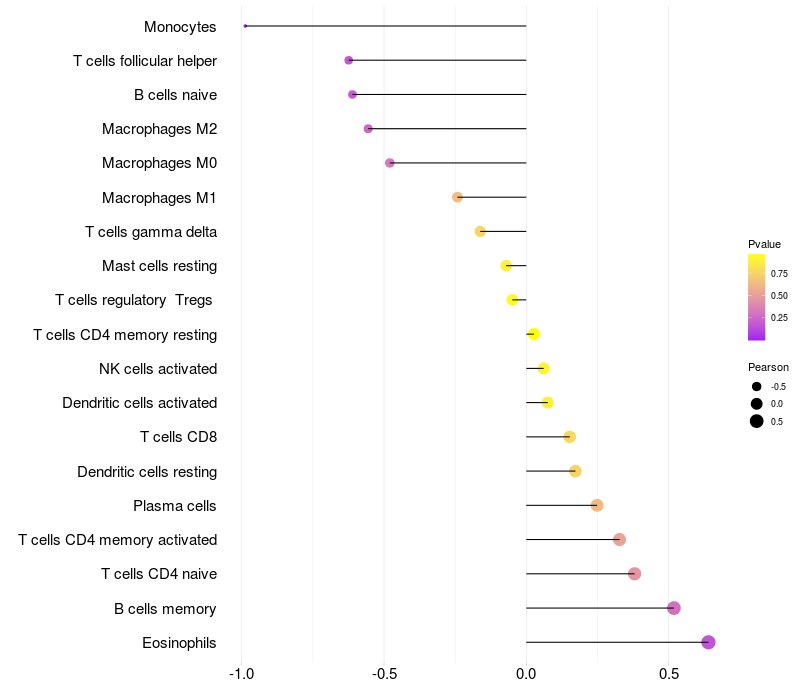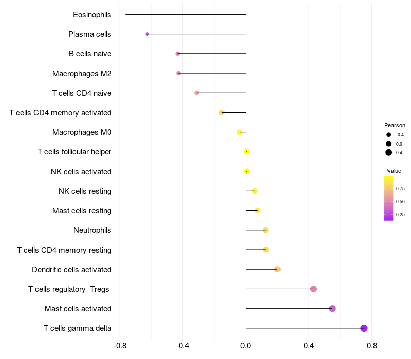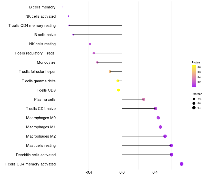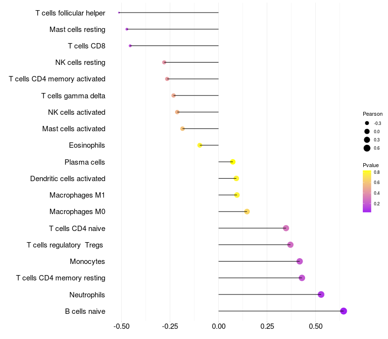 Lollipop of ENTPD8 expression and immune infiltrating cell level correlation result in EBV+ samples