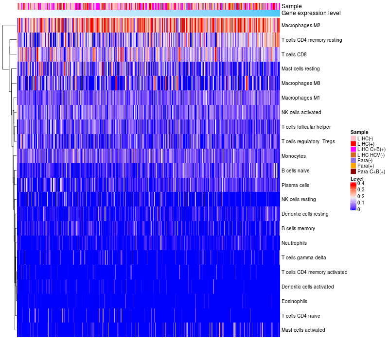 Liver hepatocellular carcinoma HCV (HBV+)(86), Liver hepatocellular carcinoma HCV (HBV-)(19), Liver hepatocellular carcinoma (HBV+)(209), Liver hepatocellular carcinoma (HBV+)(60), Paracancerous HCV (HBV+)(4), Paracancerous (HBV-)(28), Paracancerous (HBV+)(18) |