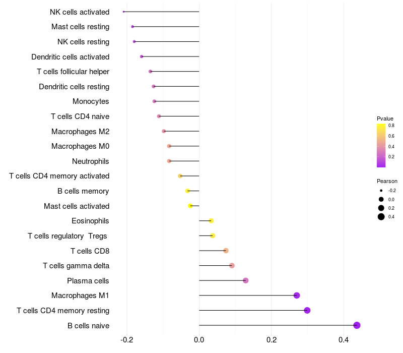 Lollipop of EPHA3 expression and immune infiltrating cell level correlation result in HBV+ samples