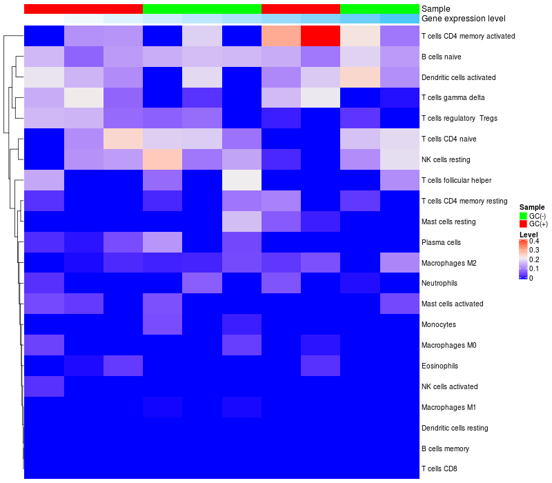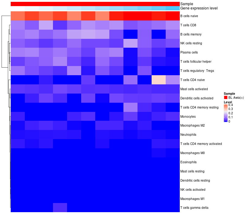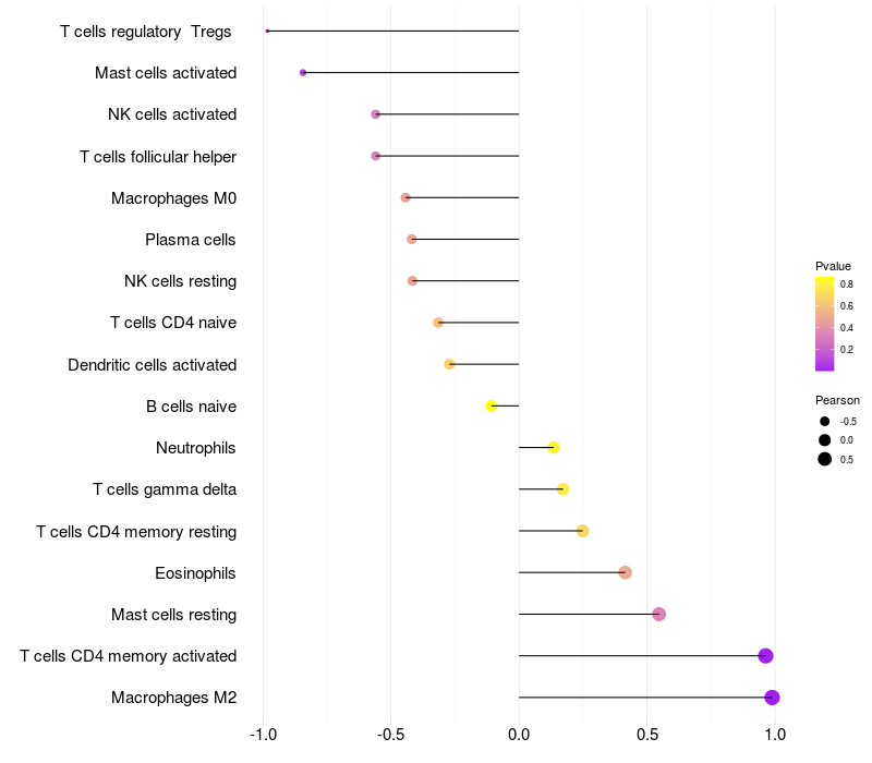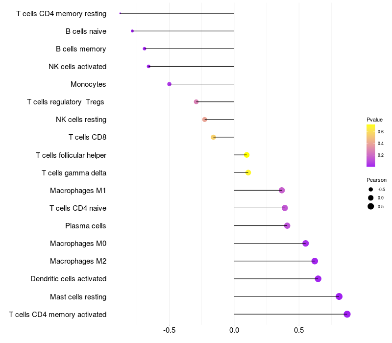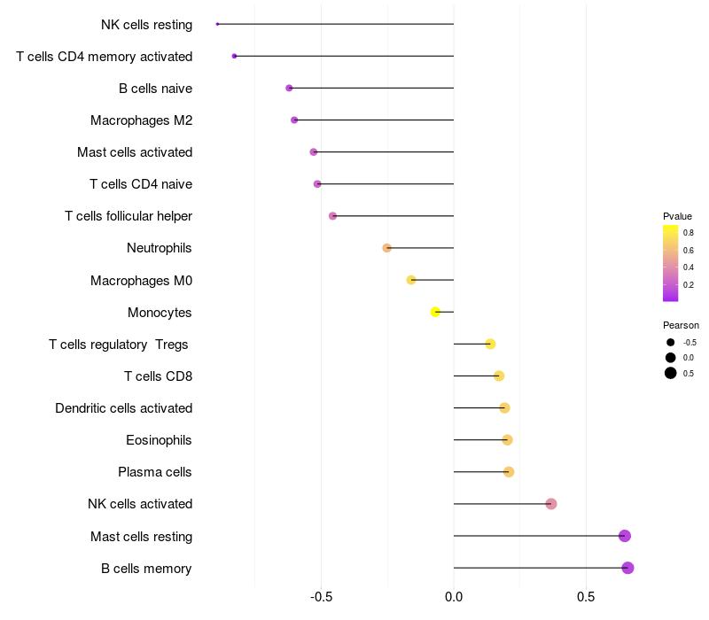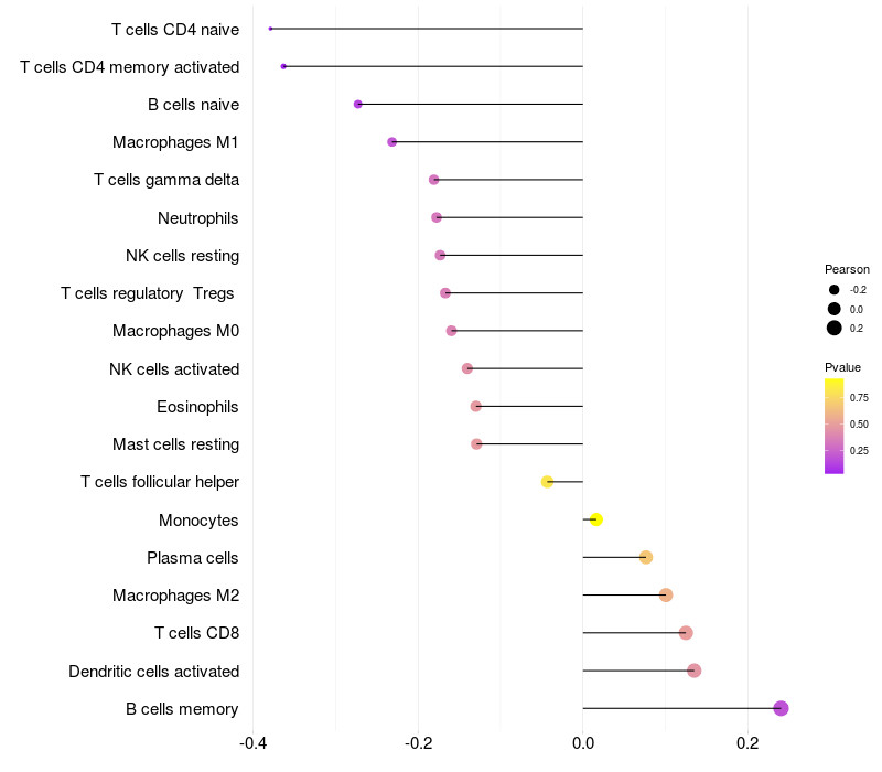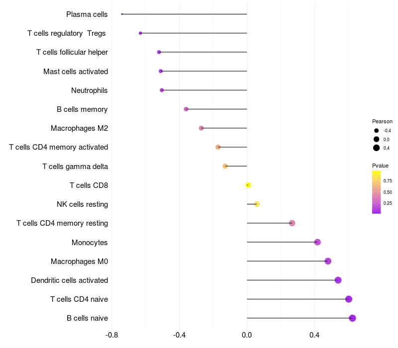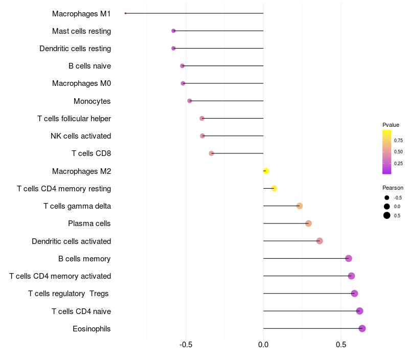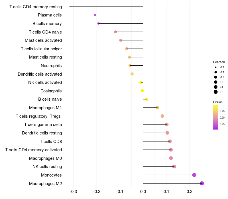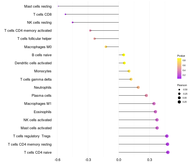 Lollipop of EPHA5 expression and immune infiltrating cell level correlation result in EBV+ samples