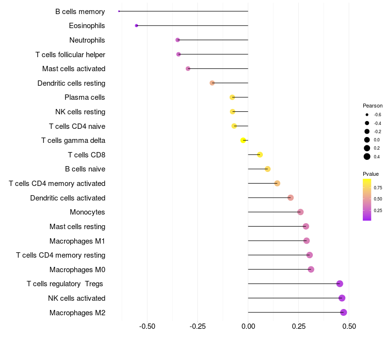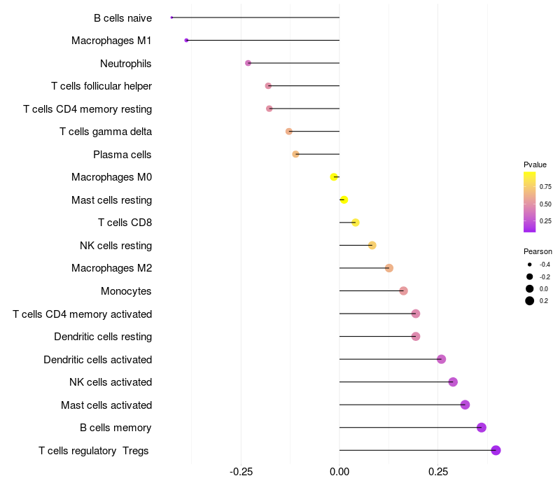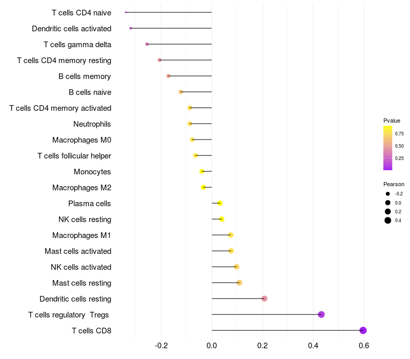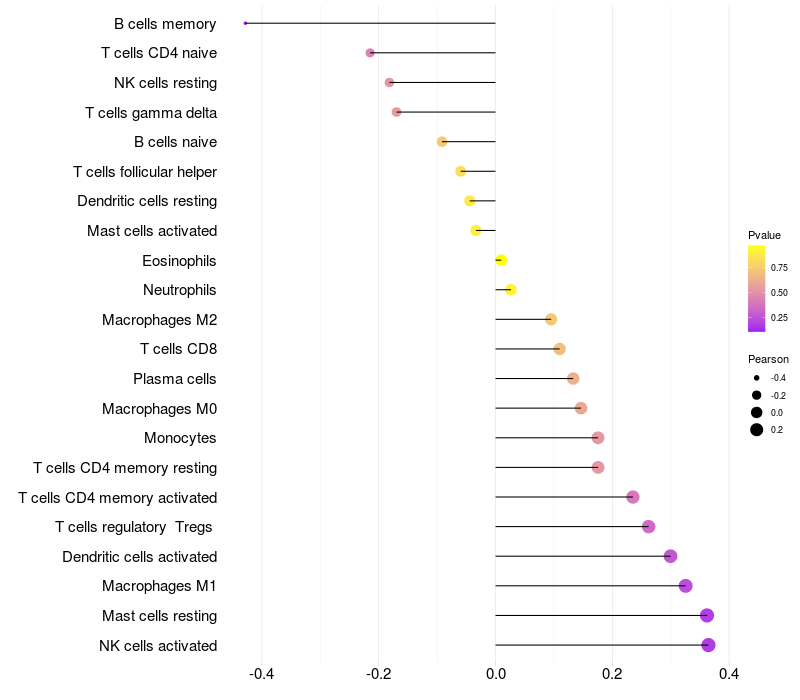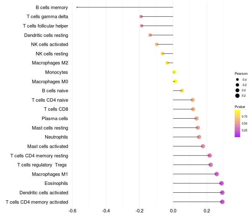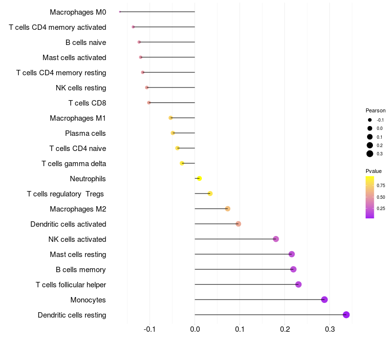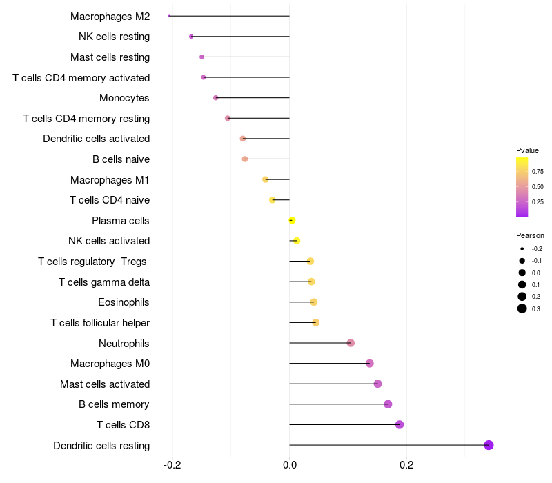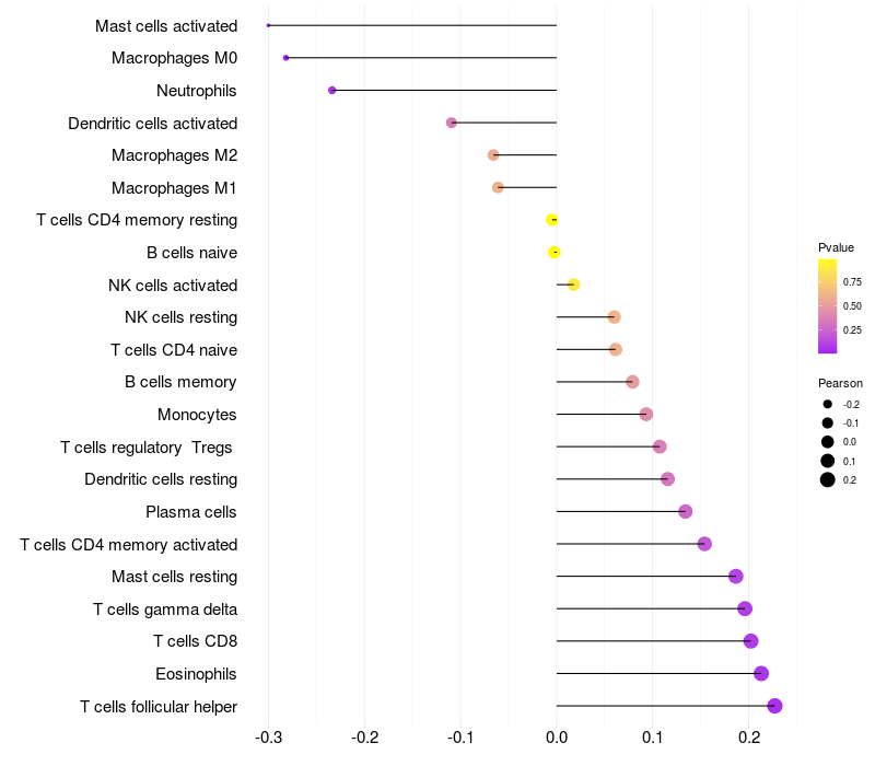 Lollipop of ERBB2 expression and immune infiltrating cell level correlation result in HPV+ samples