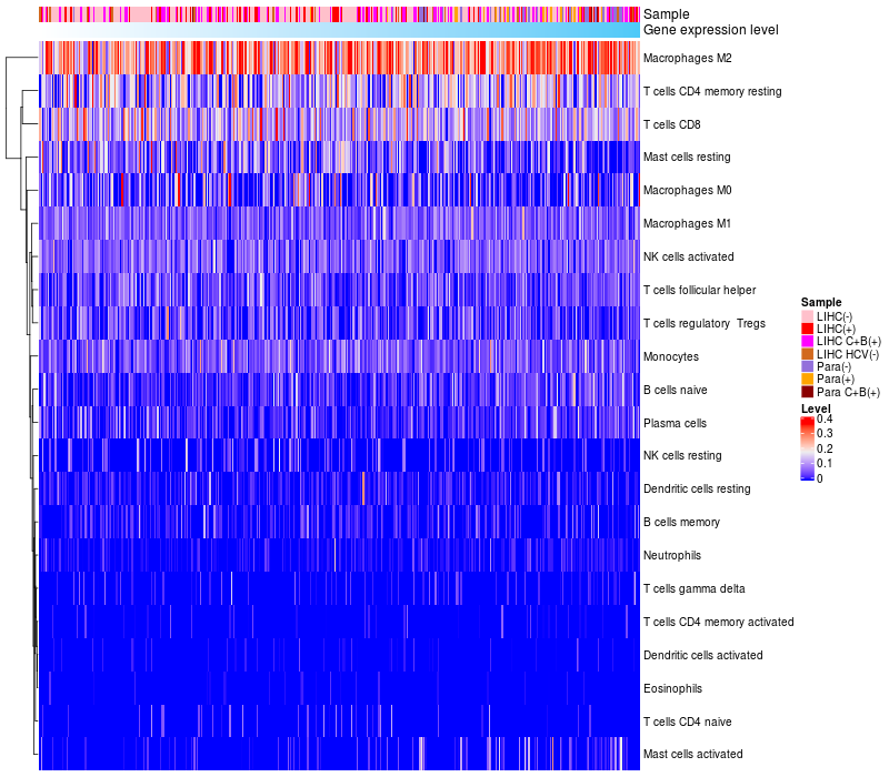 Liver hepatocellular carcinoma HCV (HBV+)(86), Liver hepatocellular carcinoma HCV (HBV-)(19), Liver hepatocellular carcinoma (HBV+)(209), Liver hepatocellular carcinoma (HBV+)(60), Paracancerous HCV (HBV+)(4), Paracancerous (HBV-)(28), Paracancerous (HBV+)(18) |