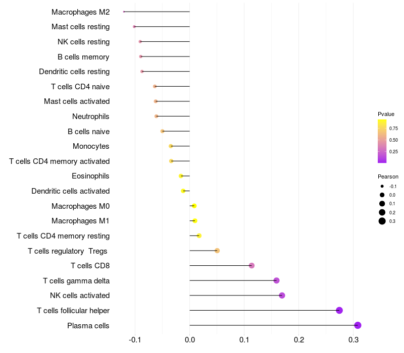 Lollipop of ERBB4 expression and immune infiltrating cell level correlation result in HBV+ samples