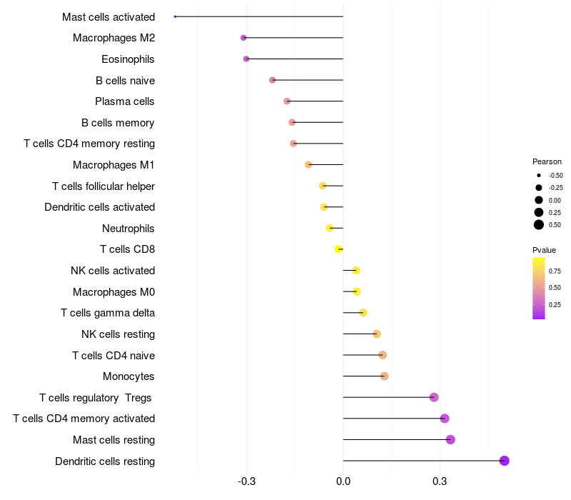 Lollipop of ESM1 expression and immune infiltrating cell level correlation result in HTLV1+ samples