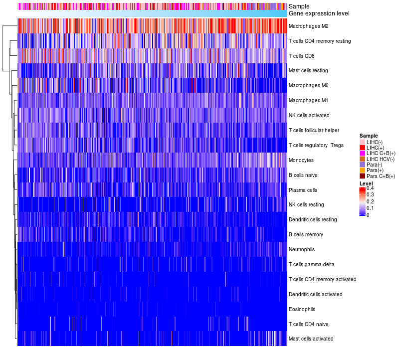 Liver hepatocellular carcinoma HCV (HBV+)(86), Liver hepatocellular carcinoma HCV (HBV-)(19), Liver hepatocellular carcinoma (HBV+)(209), Liver hepatocellular carcinoma (HBV+)(60), Paracancerous HCV (HBV+)(4), Paracancerous (HBV-)(28), Paracancerous (HBV+)(18) |