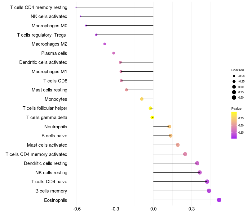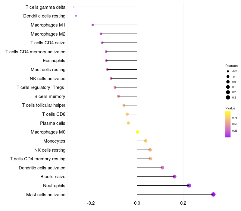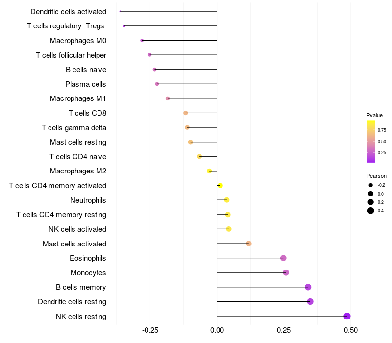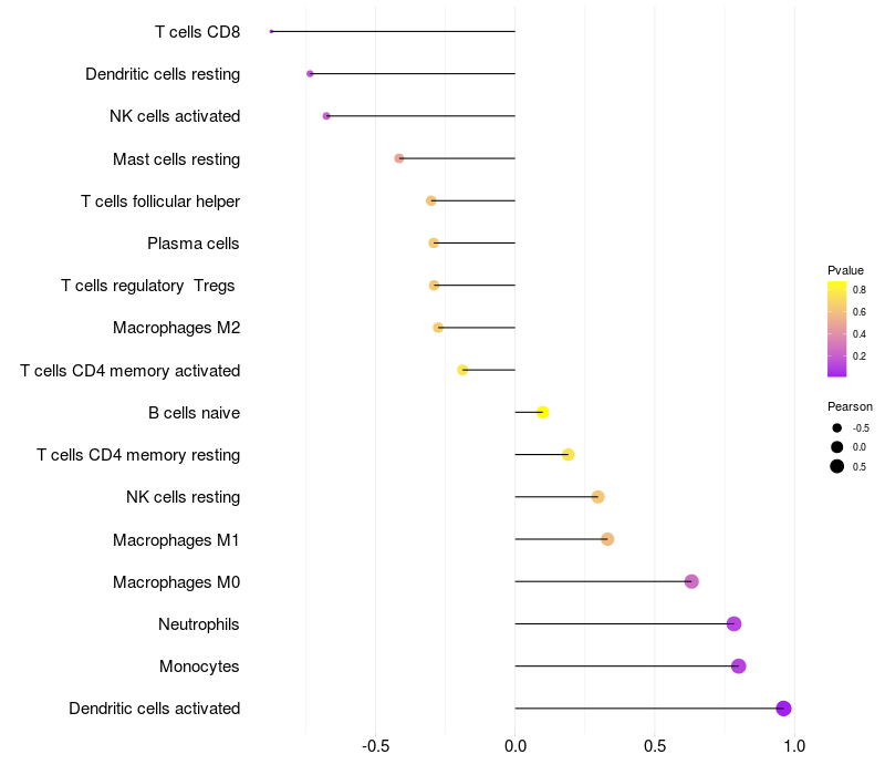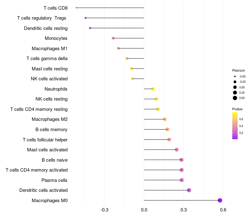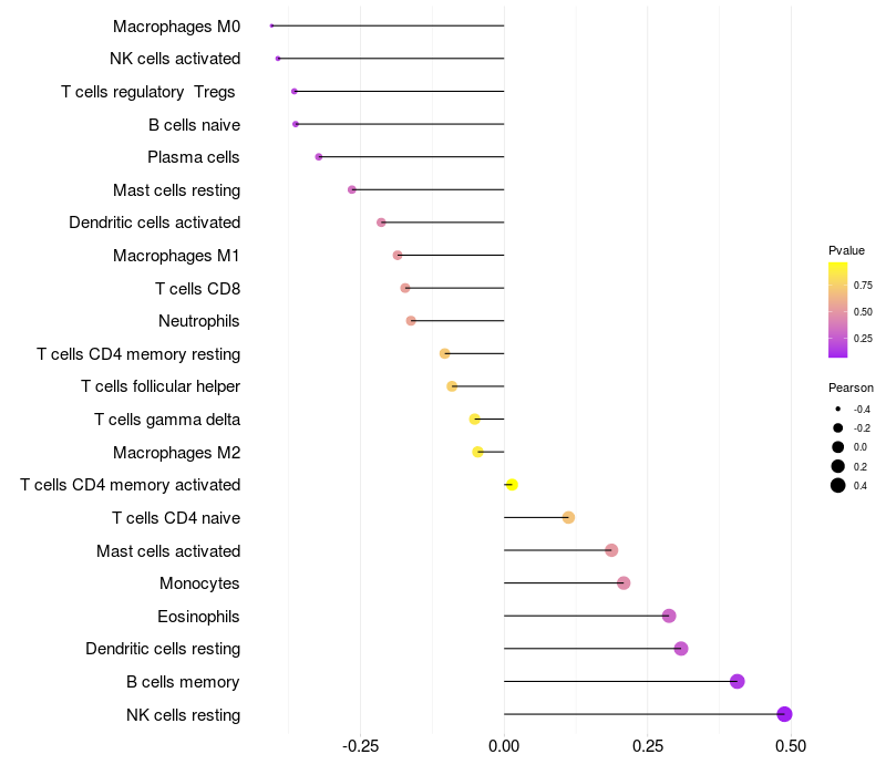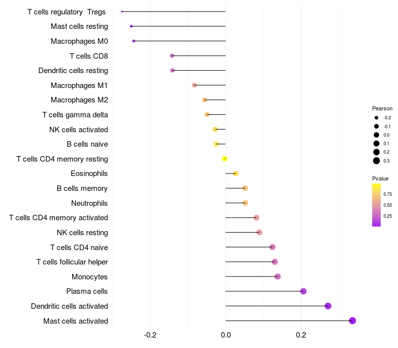 Lollipop of ETS2 expression and immune infiltrating cell level correlation result in HPV+ samples
