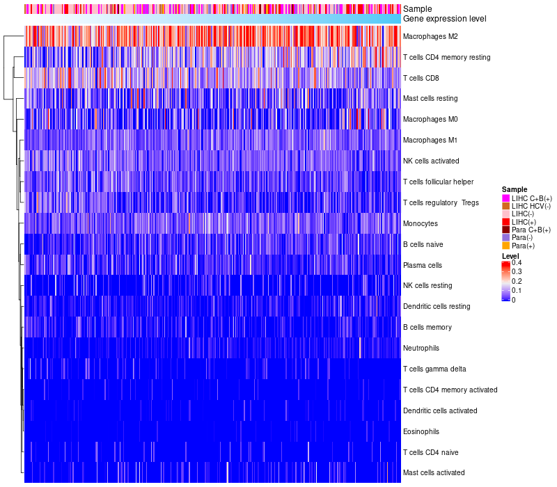 Liver hepatocellular carcinoma HCV (HBV+)(86), Liver hepatocellular carcinoma HCV (HBV-)(19), Liver hepatocellular carcinoma (HBV+)(209), Liver hepatocellular carcinoma (HBV+)(60), Paracancerous HCV (HBV+)(4), Paracancerous (HBV-)(28), Paracancerous (HBV+)(18) |