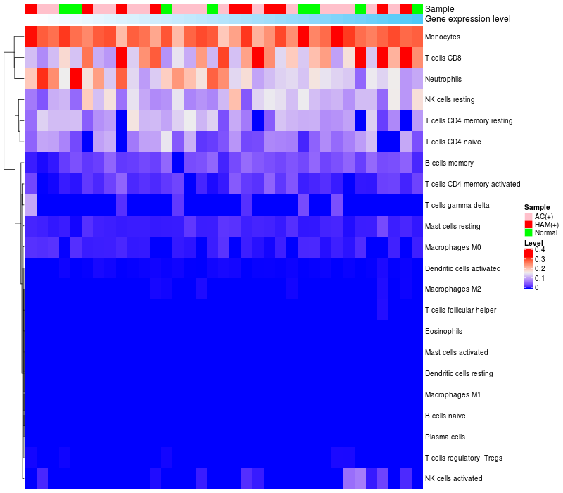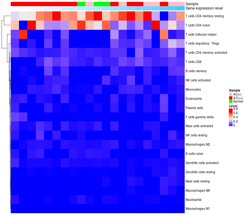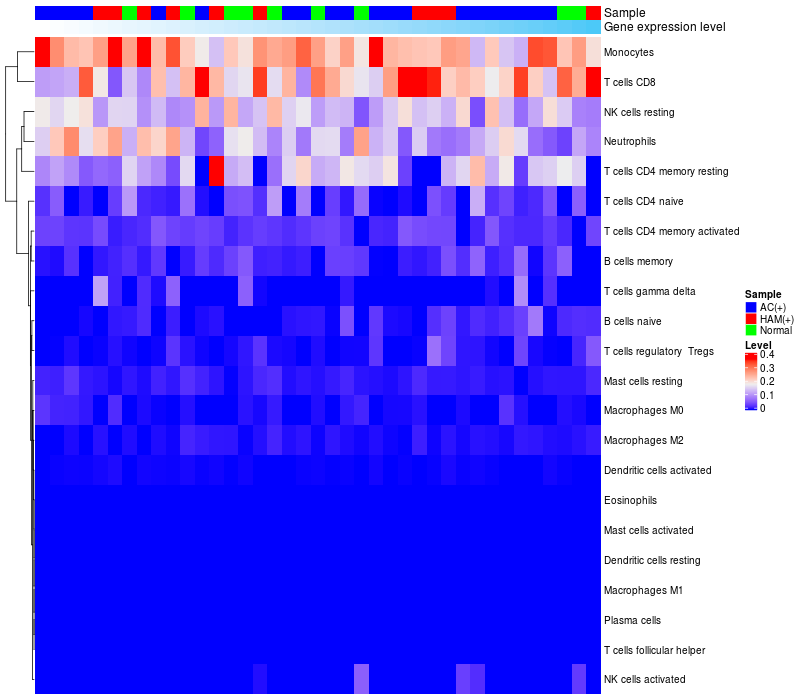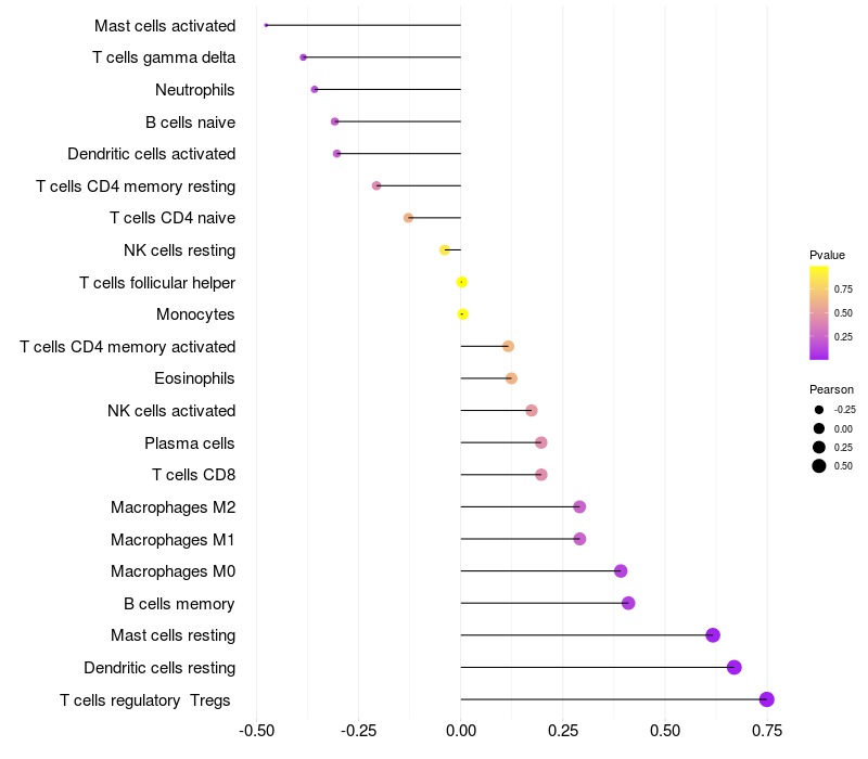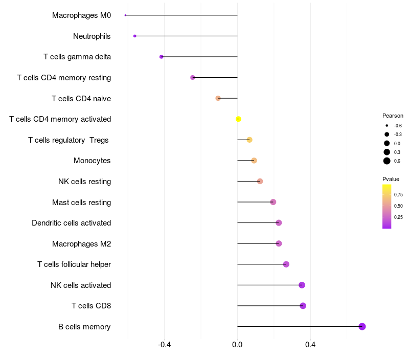 Lollipop of EVI5L expression and immune infiltrating cell level correlation result in HTLV1+ samples