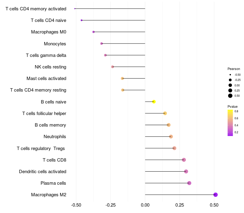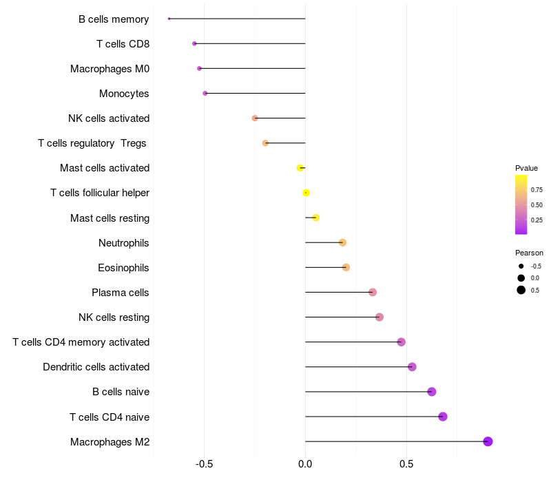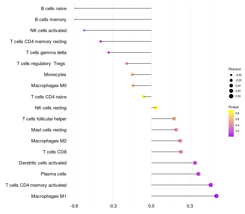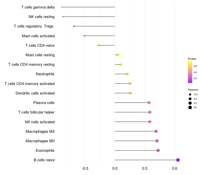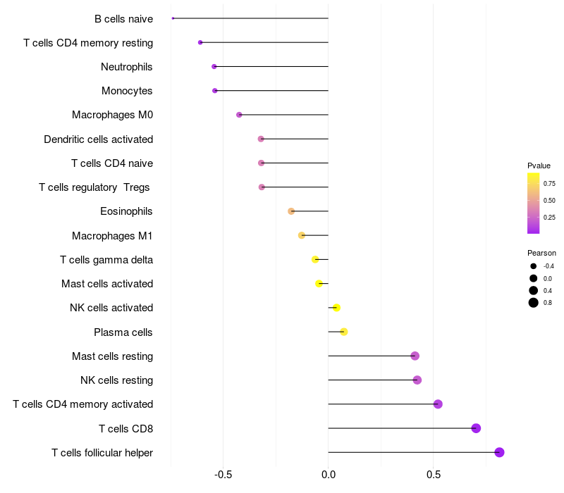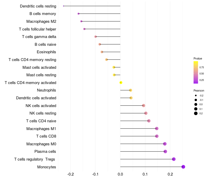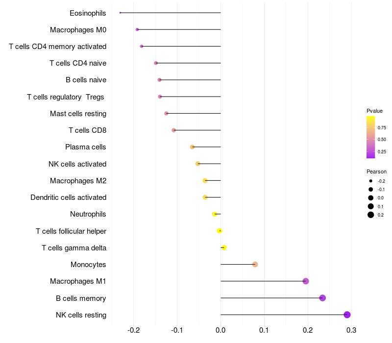 Lollipop of EWSR1 expression and immune infiltrating cell level correlation result in EBV+ samples