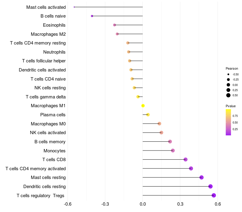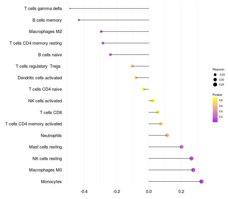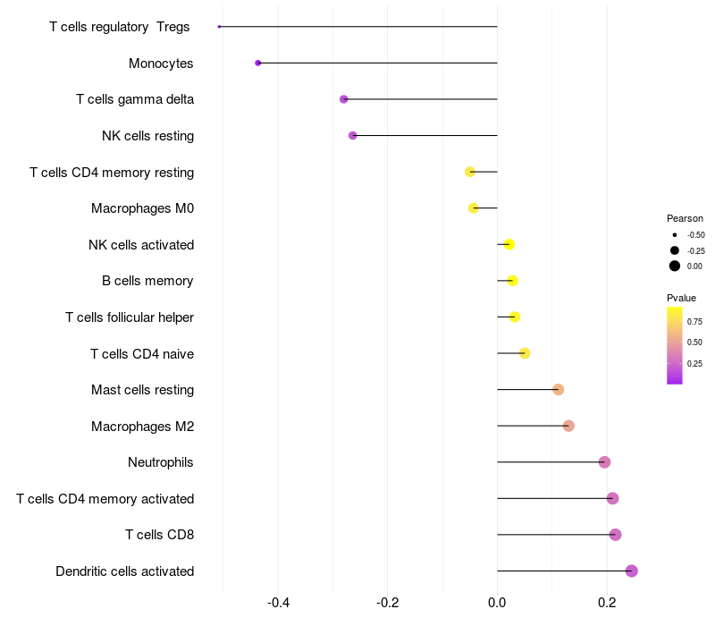 Lollipop of EXOC1 expression and immune infiltrating cell level correlation result in HTLV1+ samples