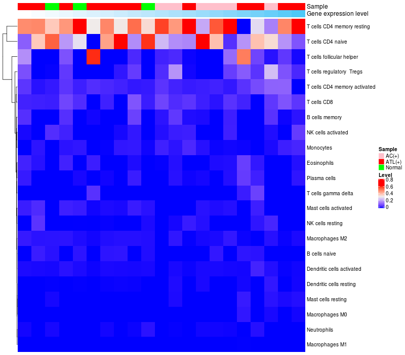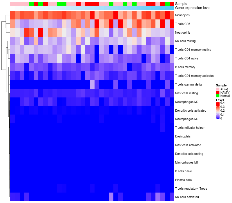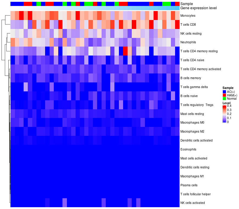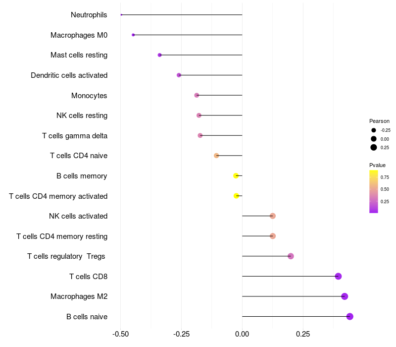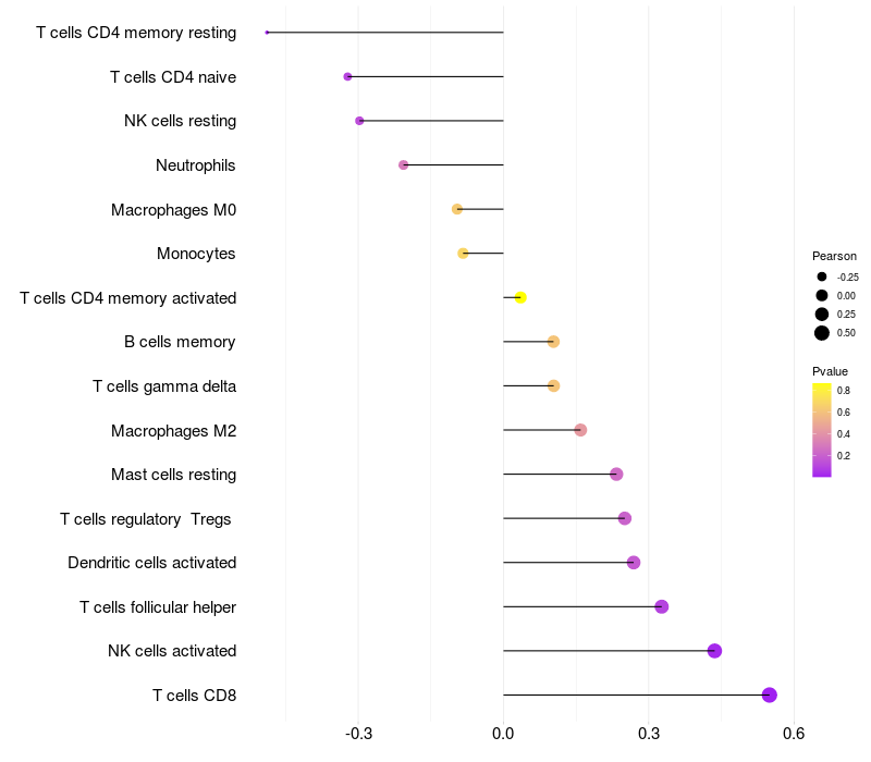 Lollipop of EXOSC3 expression and immune infiltrating cell level correlation result in HTLV1+ samples