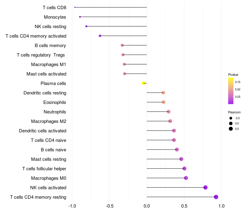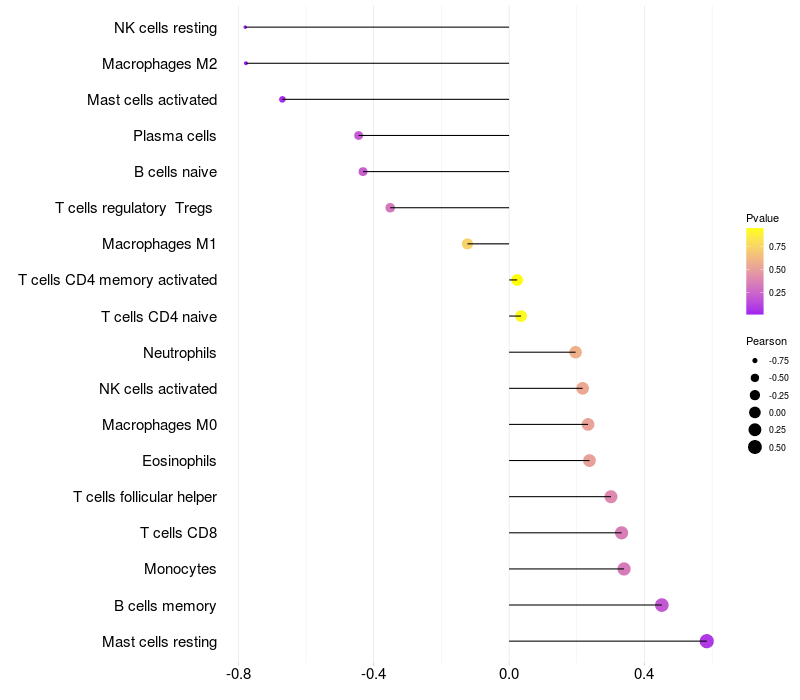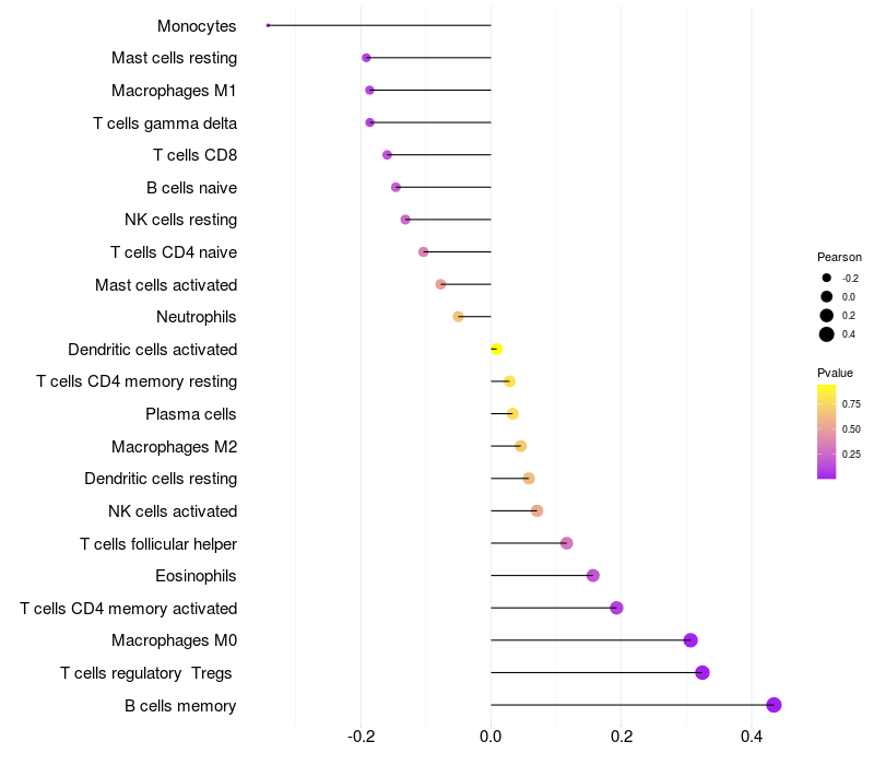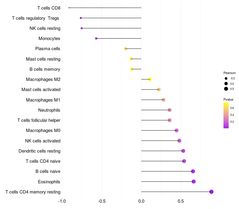 Lollipop of EXT1 expression and immune infiltrating cell level correlation result in HBV+ Liver cirrhosis samples