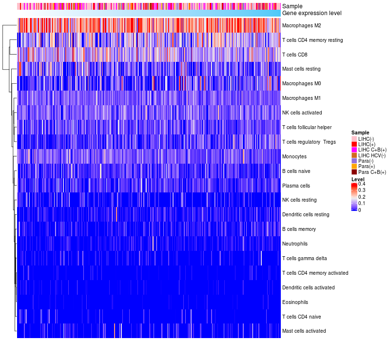 Liver hepatocellular carcinoma HCV (HBV+)(86), Liver hepatocellular carcinoma HCV (HBV-)(19), Liver hepatocellular carcinoma (HBV+)(209), Liver hepatocellular carcinoma (HBV+)(60), Paracancerous HCV (HBV+)(4), Paracancerous (HBV-)(28), Paracancerous (HBV+)(18) |
