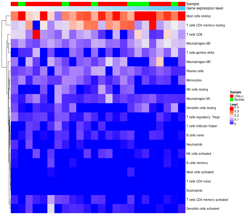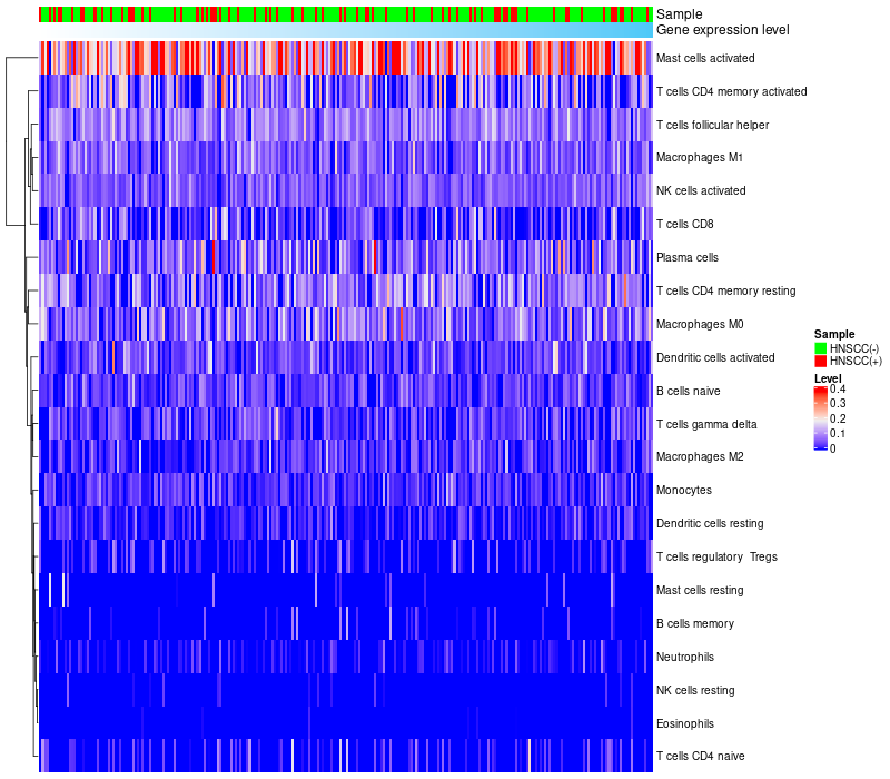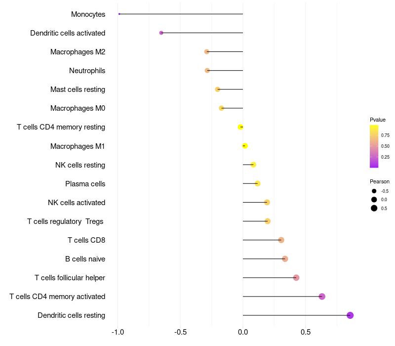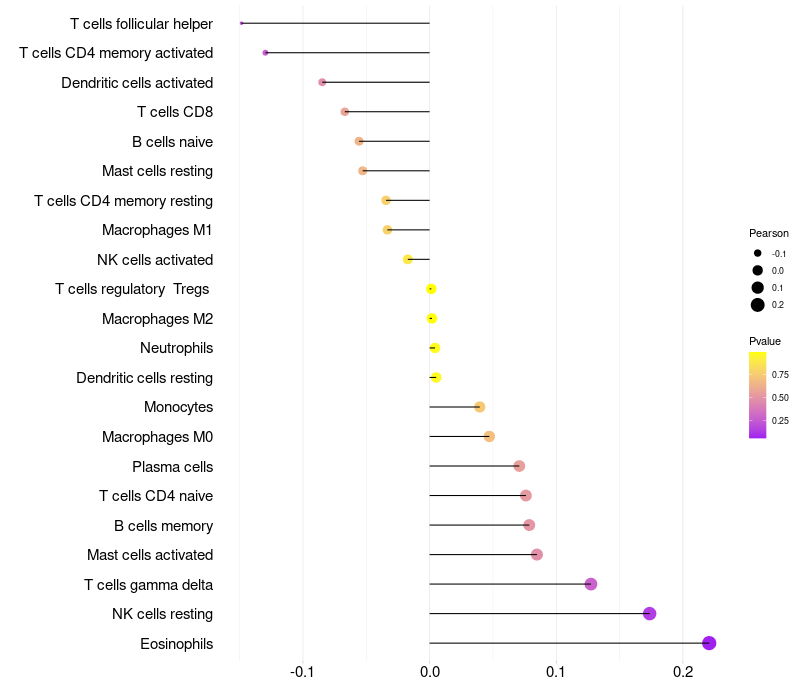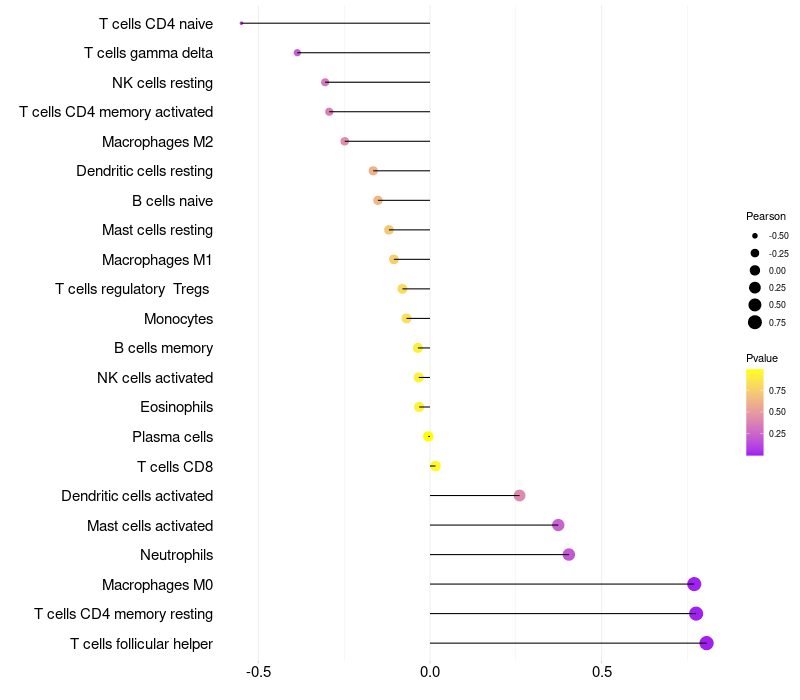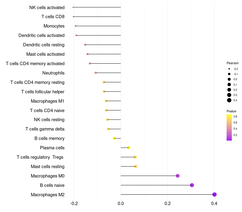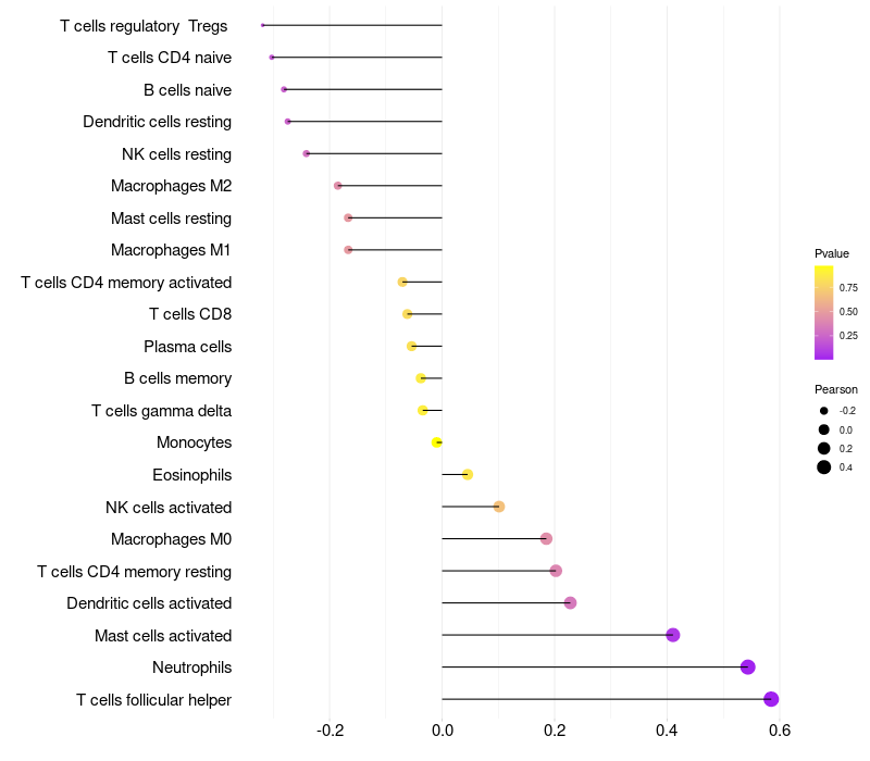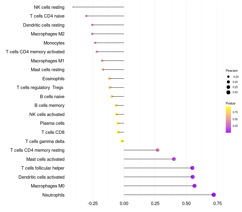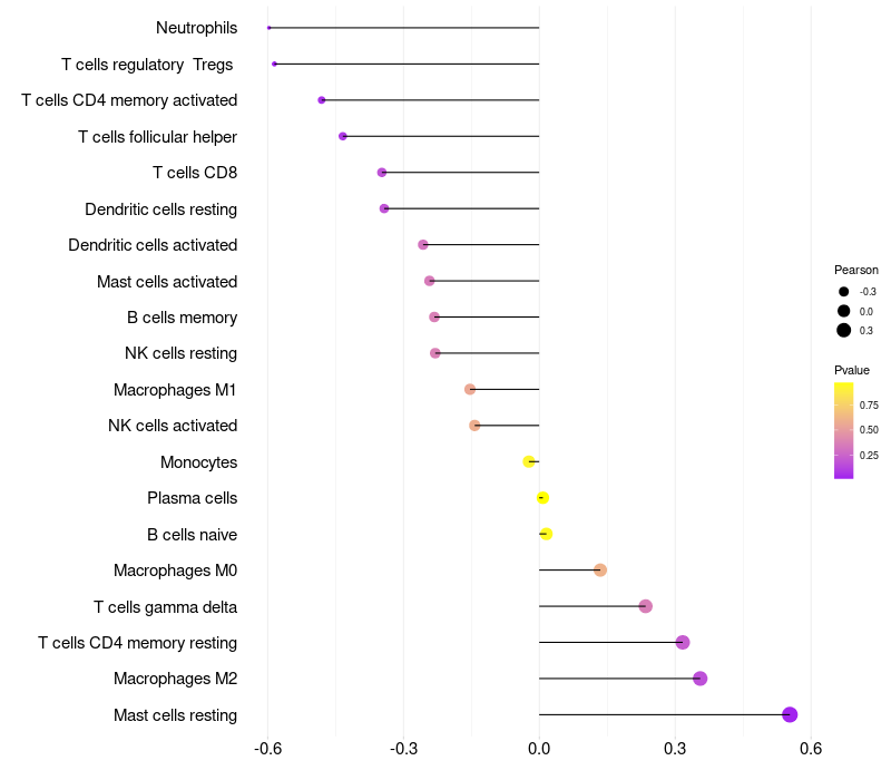 Lollipop of EXTL1 expression and immune infiltrating cell level correlation result in HPV+ samples