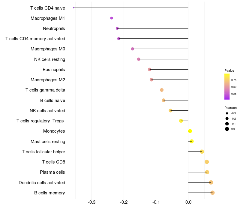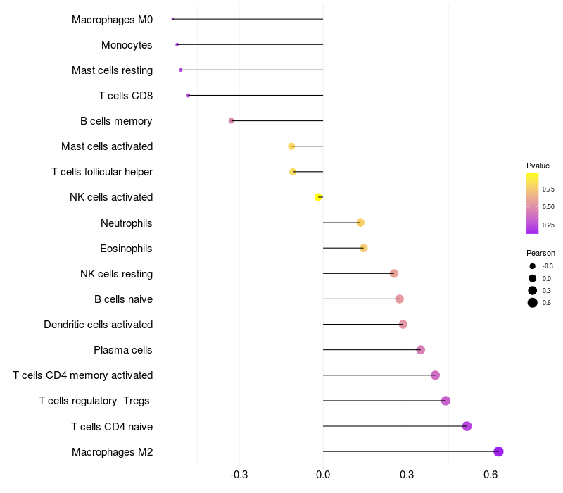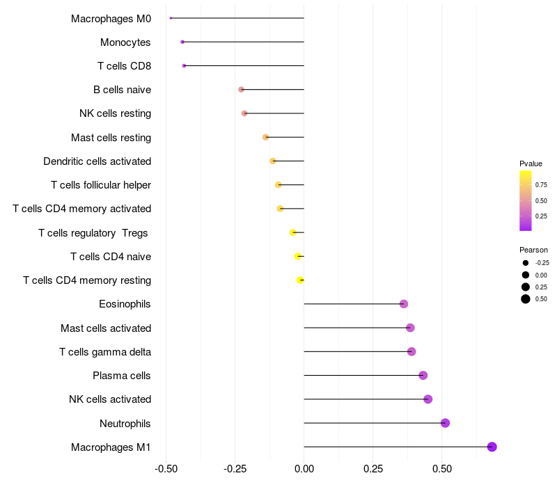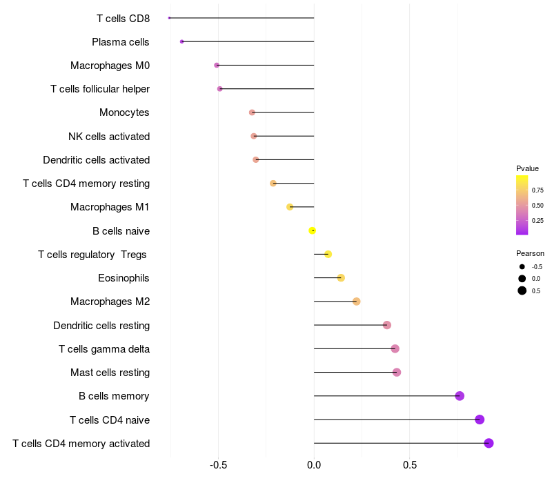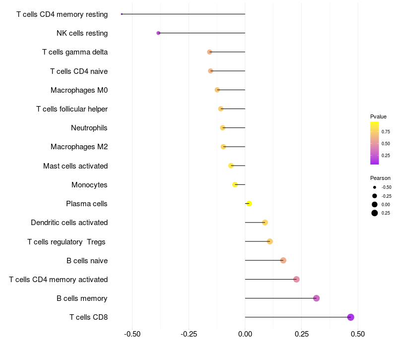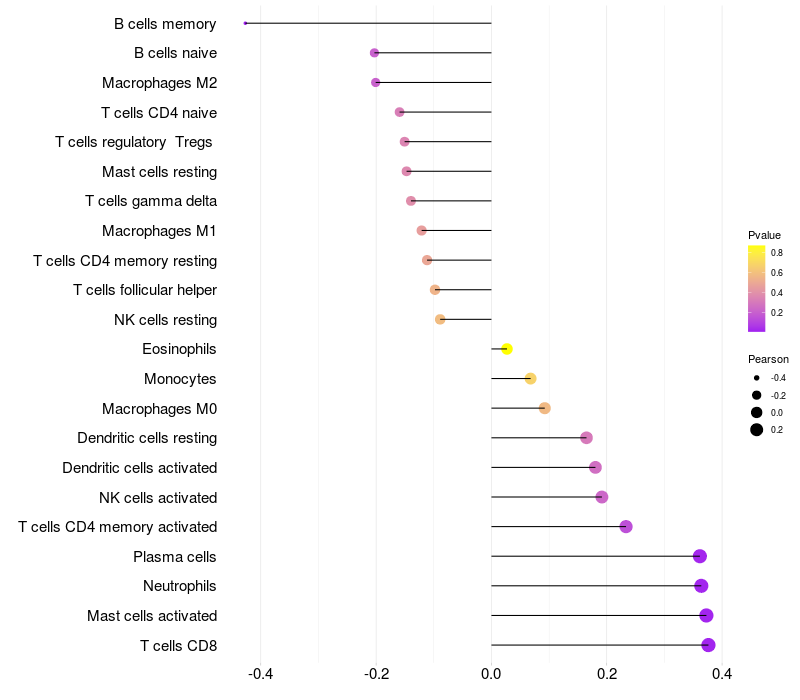 Lollipop of EYS expression and immune infiltrating cell level correlation result in EBV+ samples