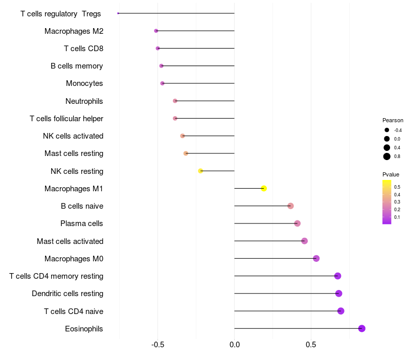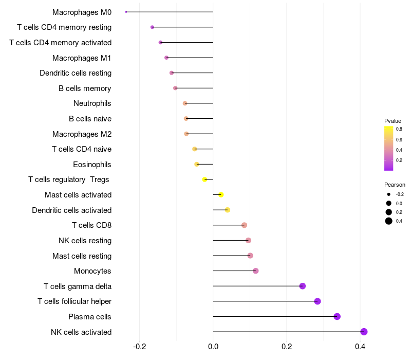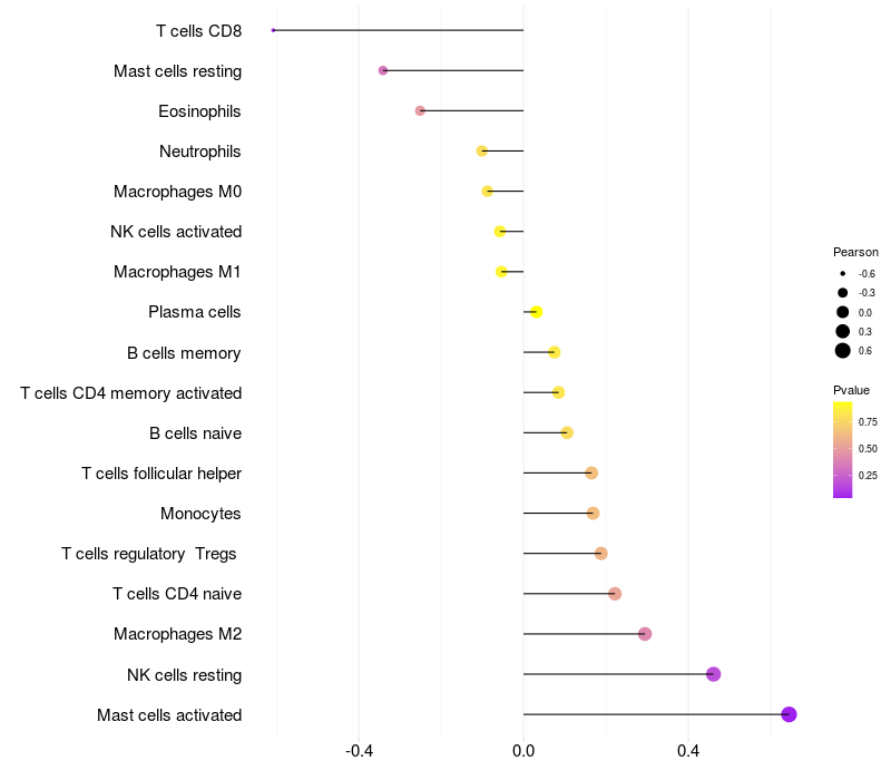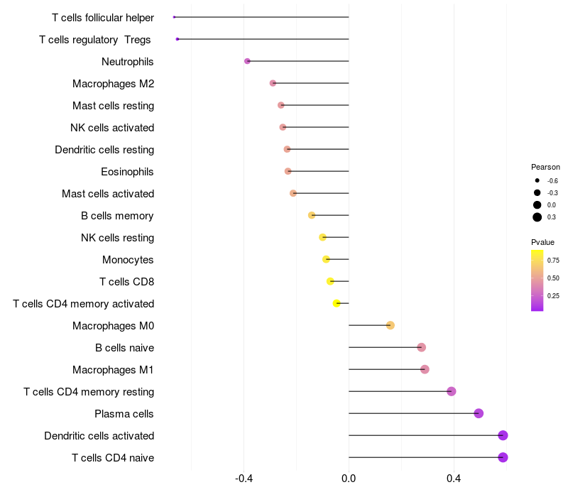 Lollipop of F10 expression and immune infiltrating cell level correlation result in HBV+ Liver cirrhosis samples