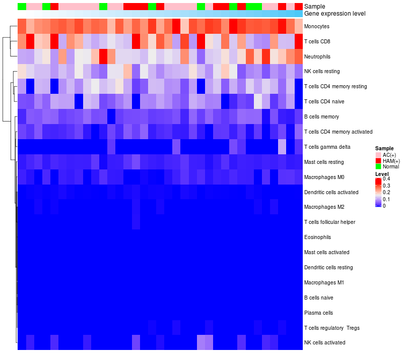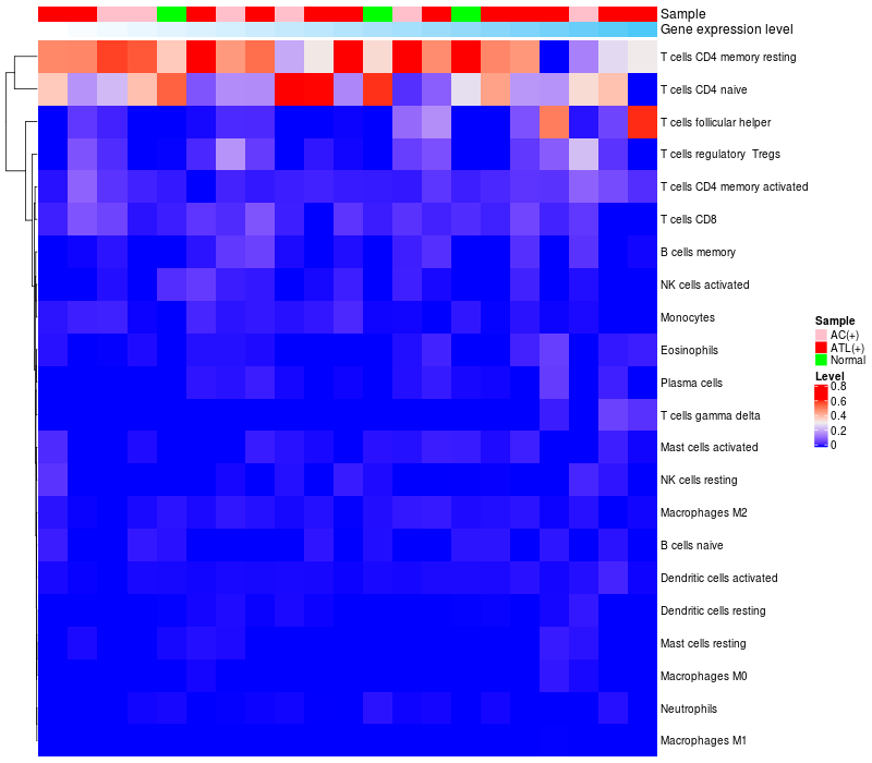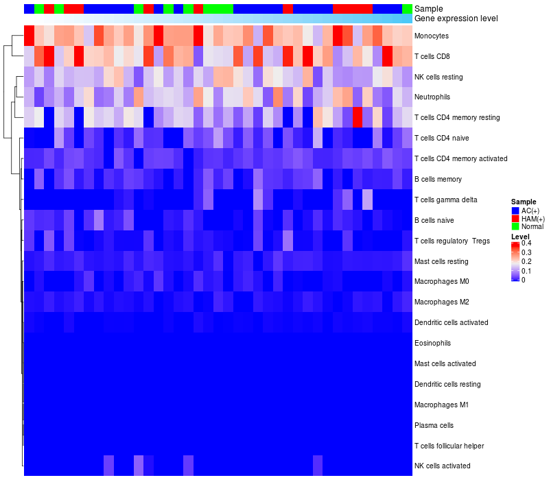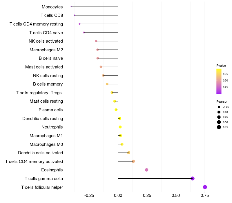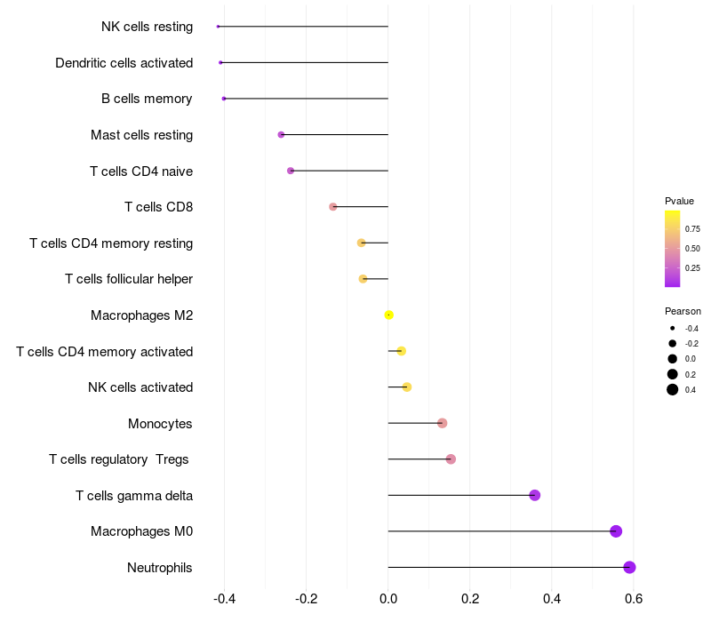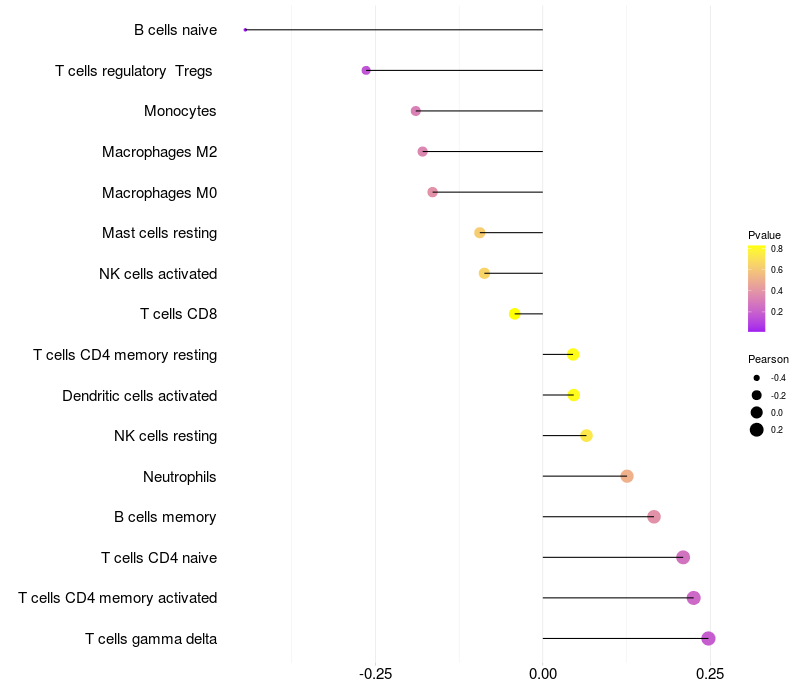 Lollipop of FABP6 expression and immune infiltrating cell level correlation result in HTLV1+ samples