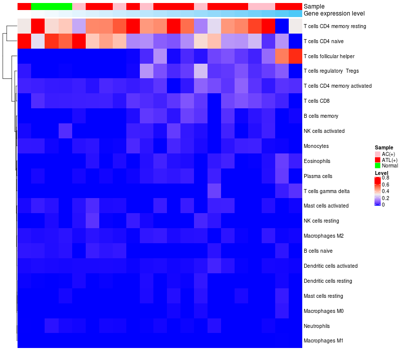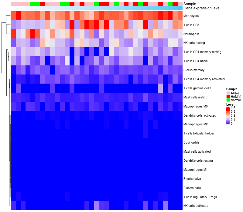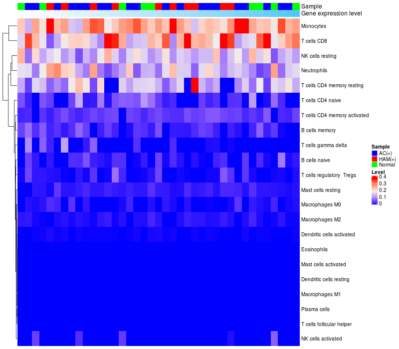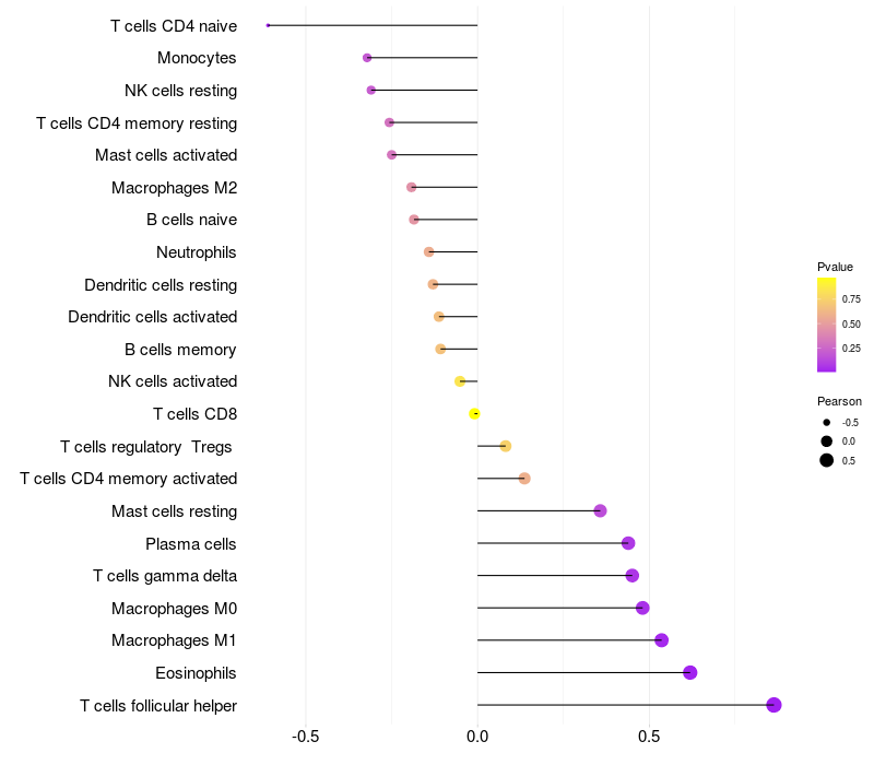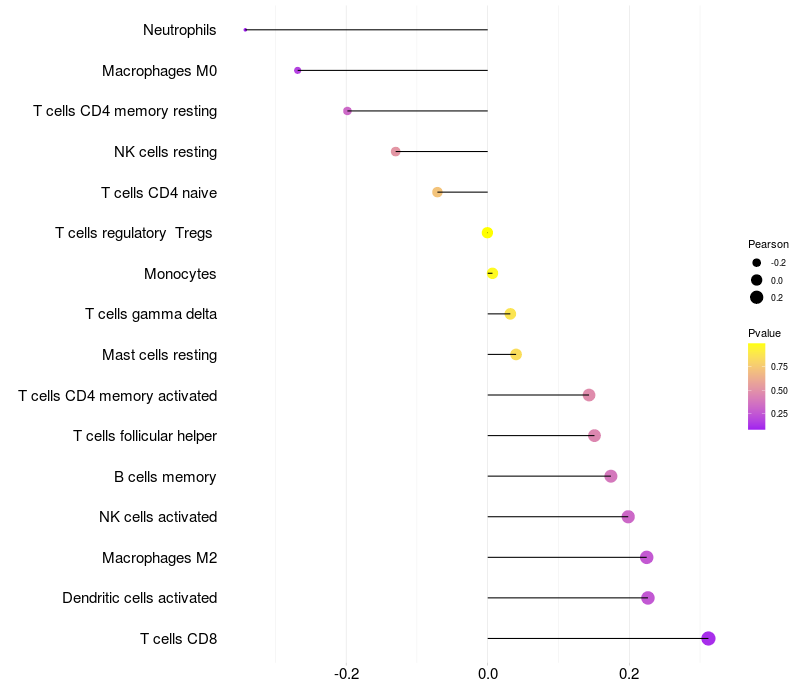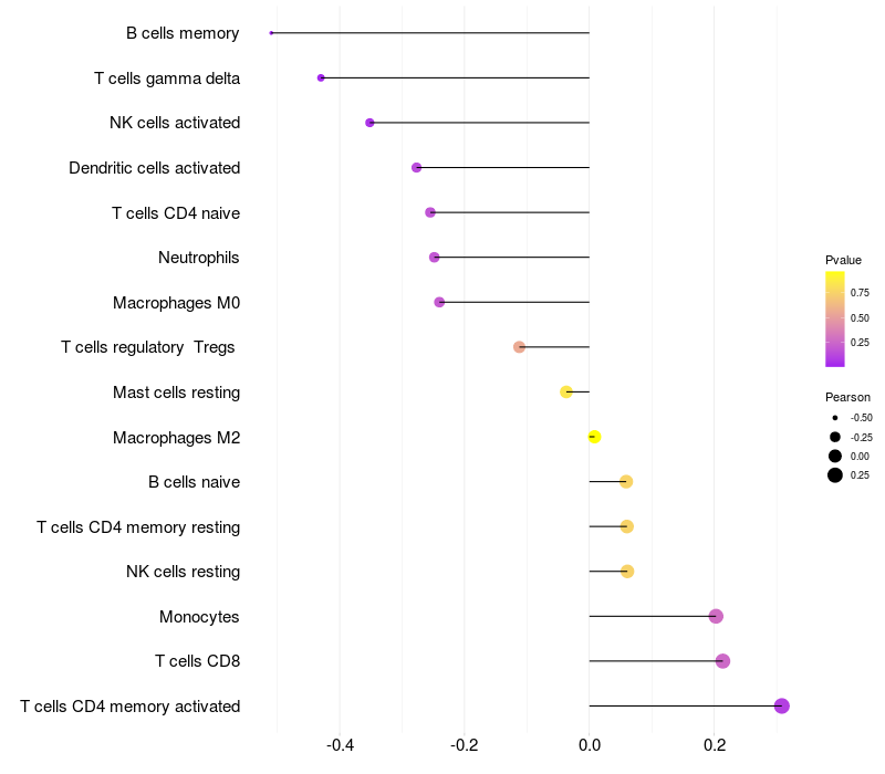 Lollipop of FAM102B expression and immune infiltrating cell level correlation result in HTLV1+ samples