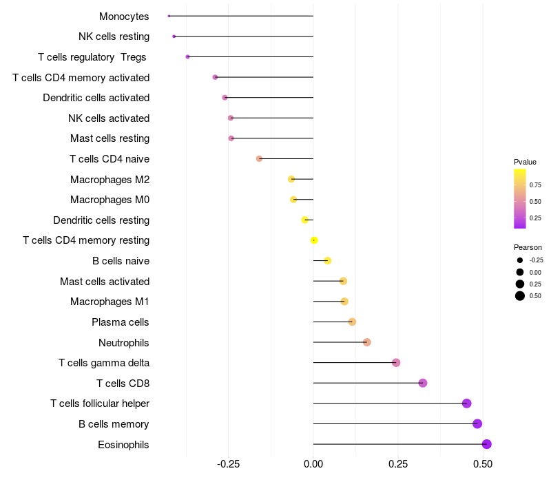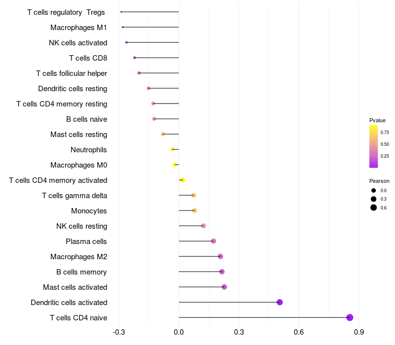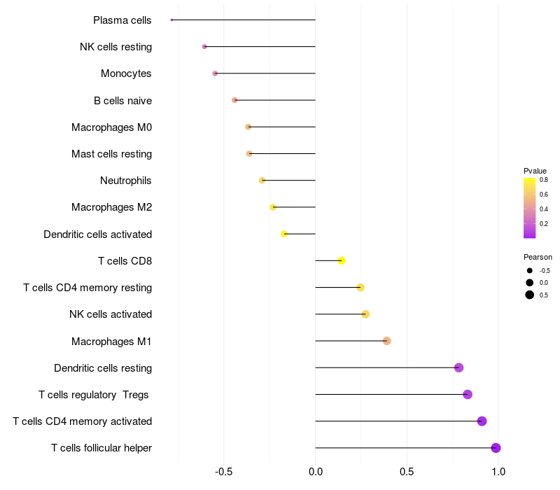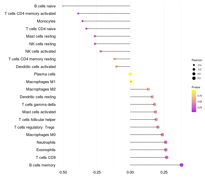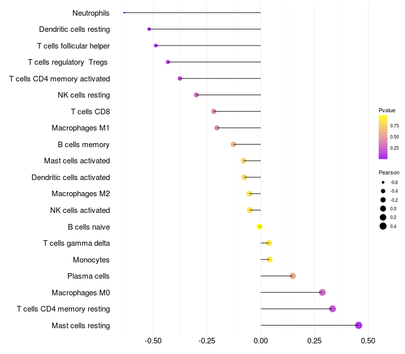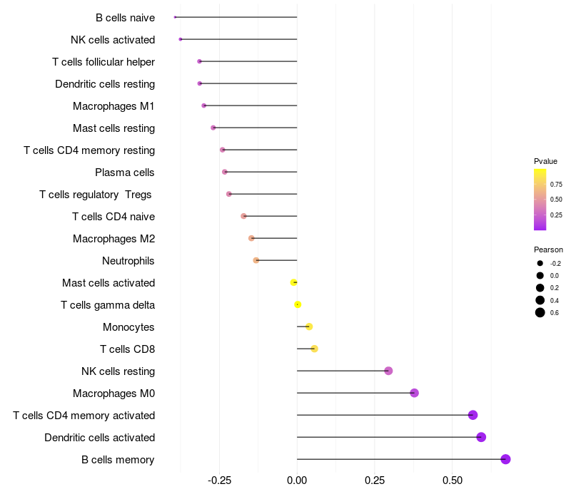 Lollipop of FAM155B expression and immune infiltrating cell level correlation result in HPV+ samples