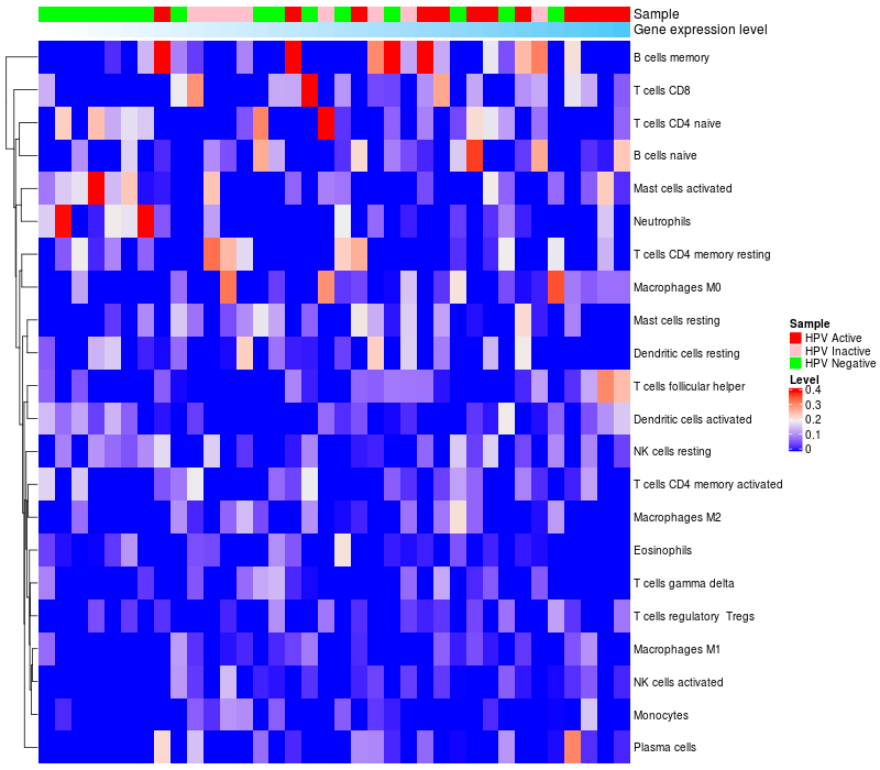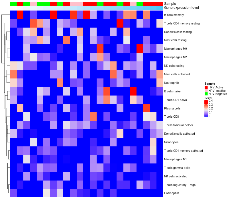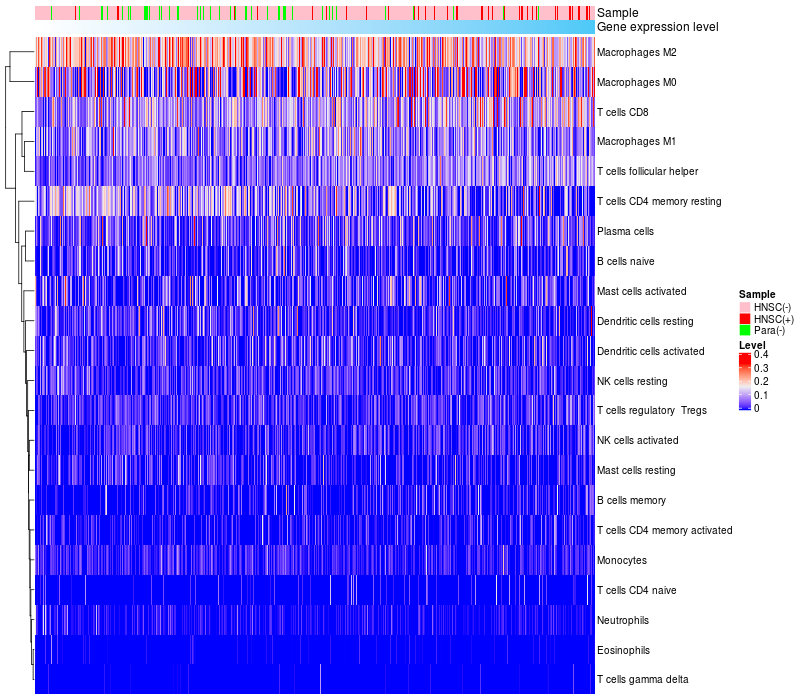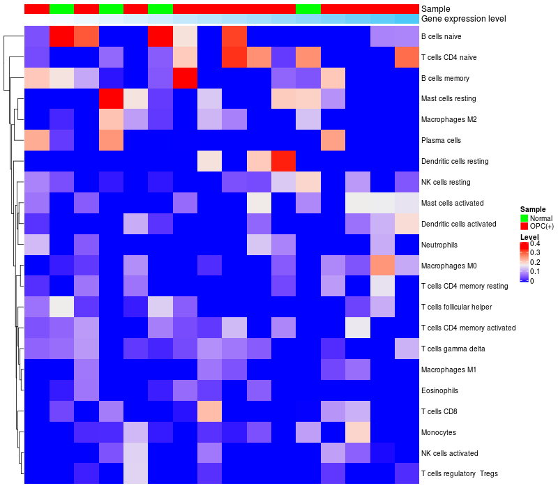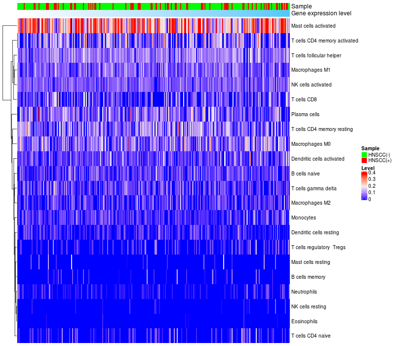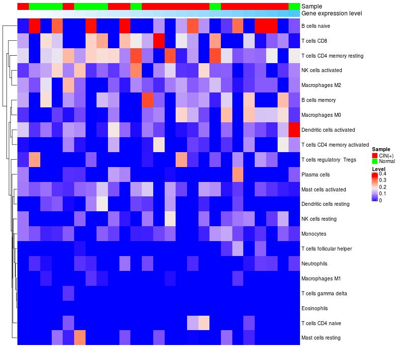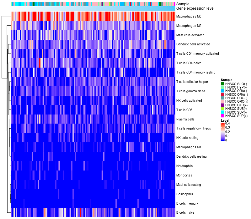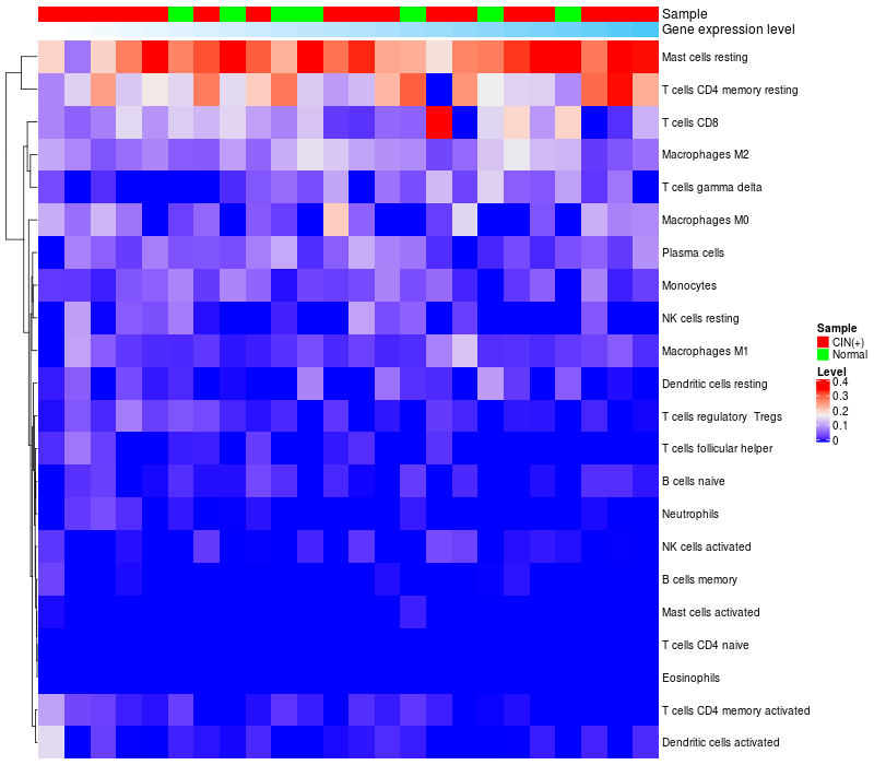 • Left: Heatmap of target gene expression and the level of various types of immune cells (cell type fractions) in all samples based on CIBERSORT method.