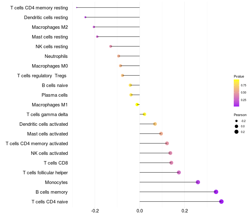 • Right: Correlation of target gene expression and the level of various types of immune cells in virus positive samples (Pearson Correlation Coefficient).