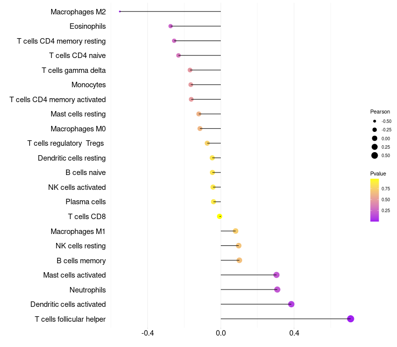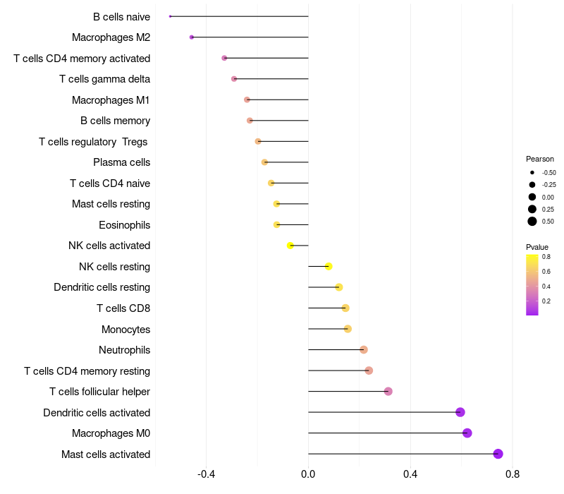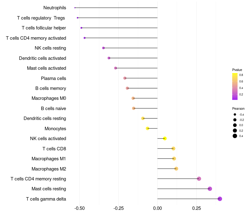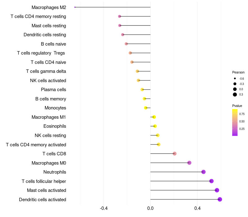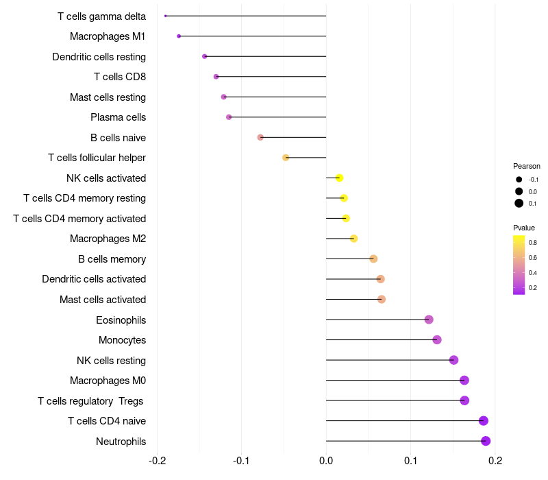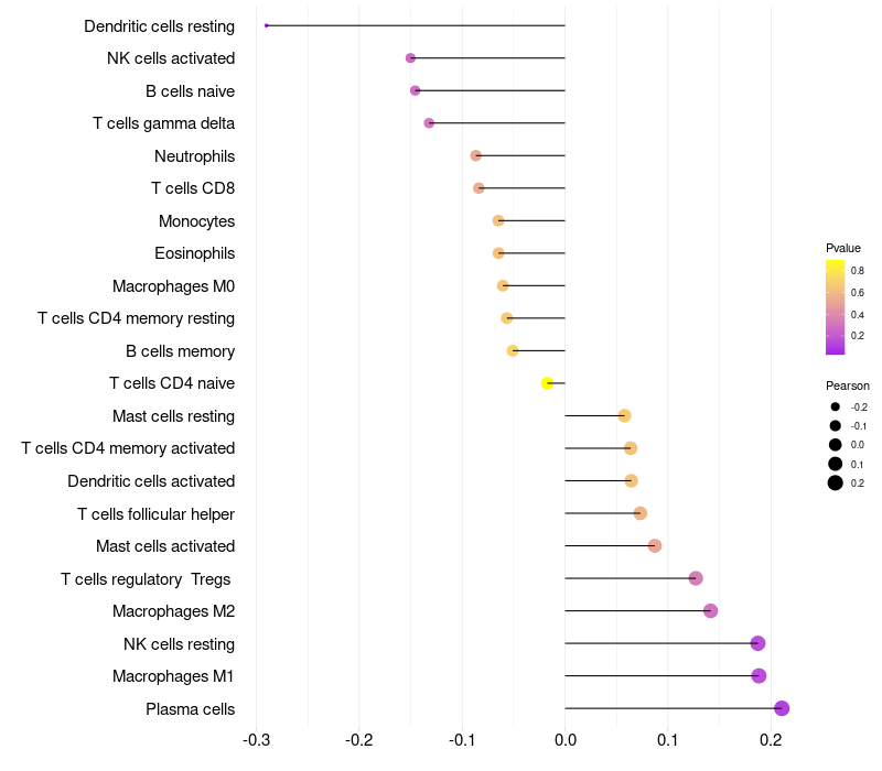 Lollipop of FAM156B expression and immune infiltrating cell level correlation result in HPV+ samples