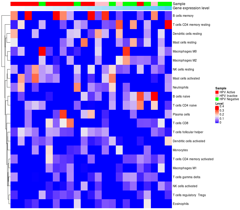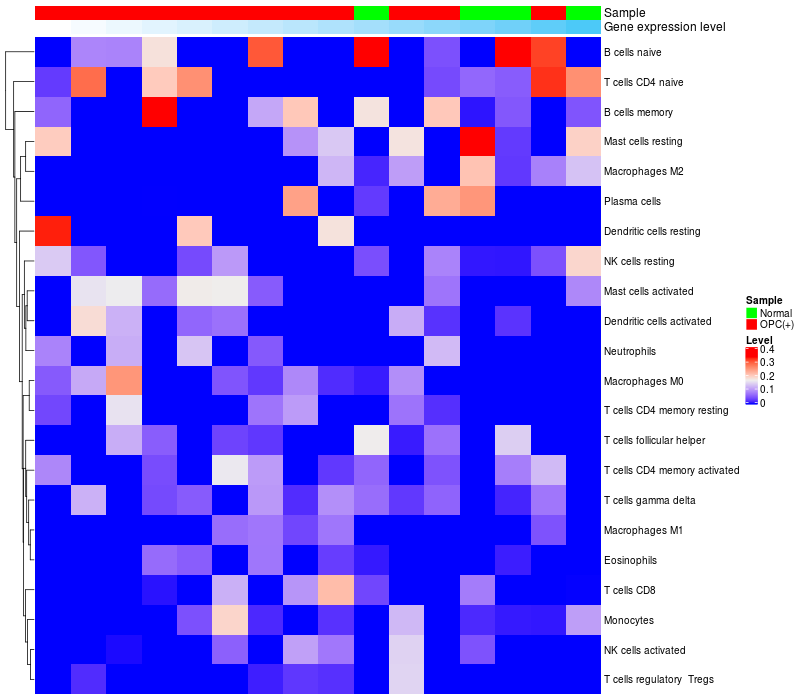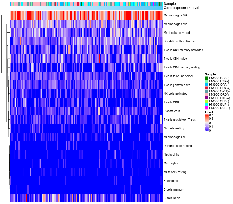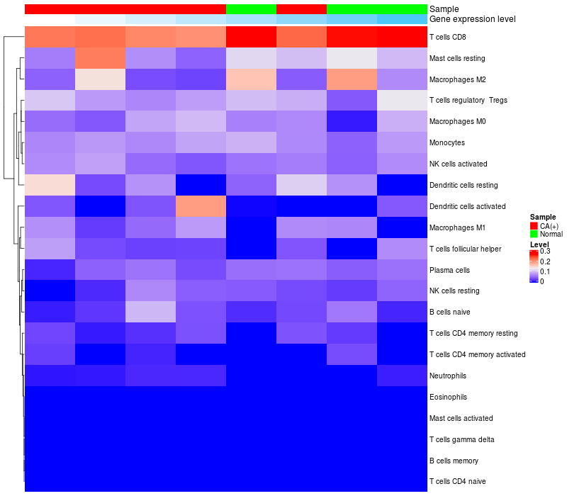 • Left: Heatmap of target gene expression and the level of various types of immune cells (cell type fractions) in all samples based on CIBERSORT method.