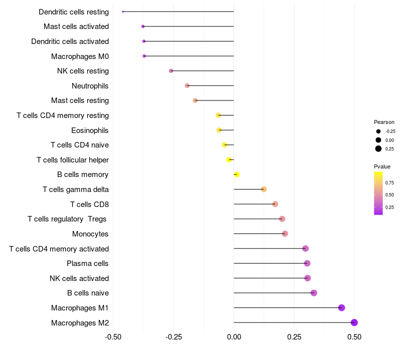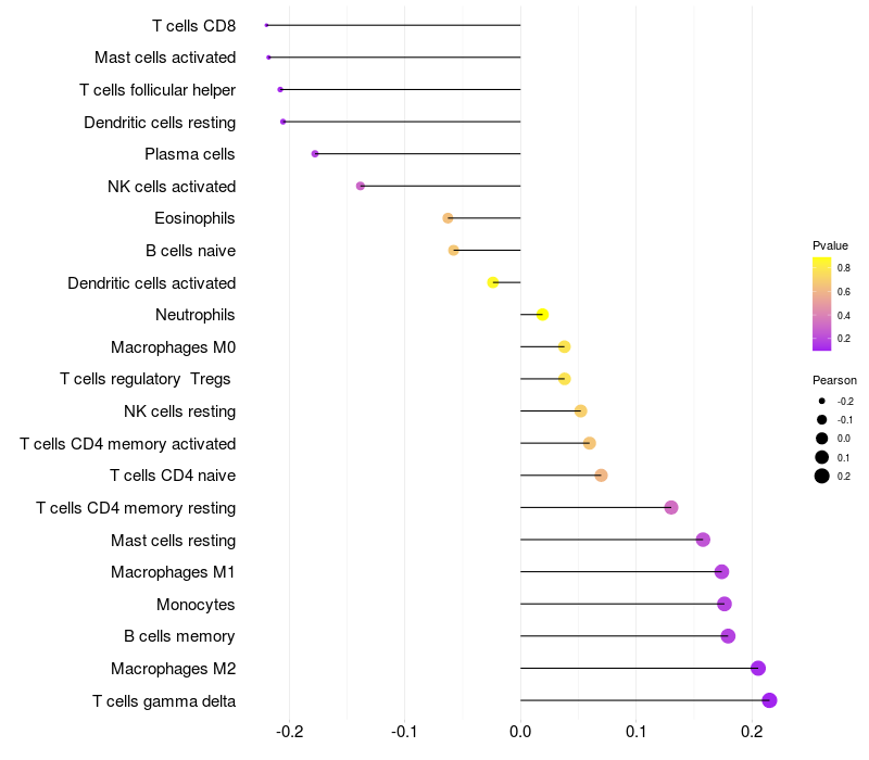 • Right: Correlation of target gene expression and the level of various types of immune cells in virus positive samples (Pearson Correlation Coefficient).