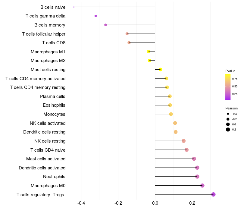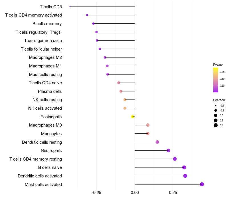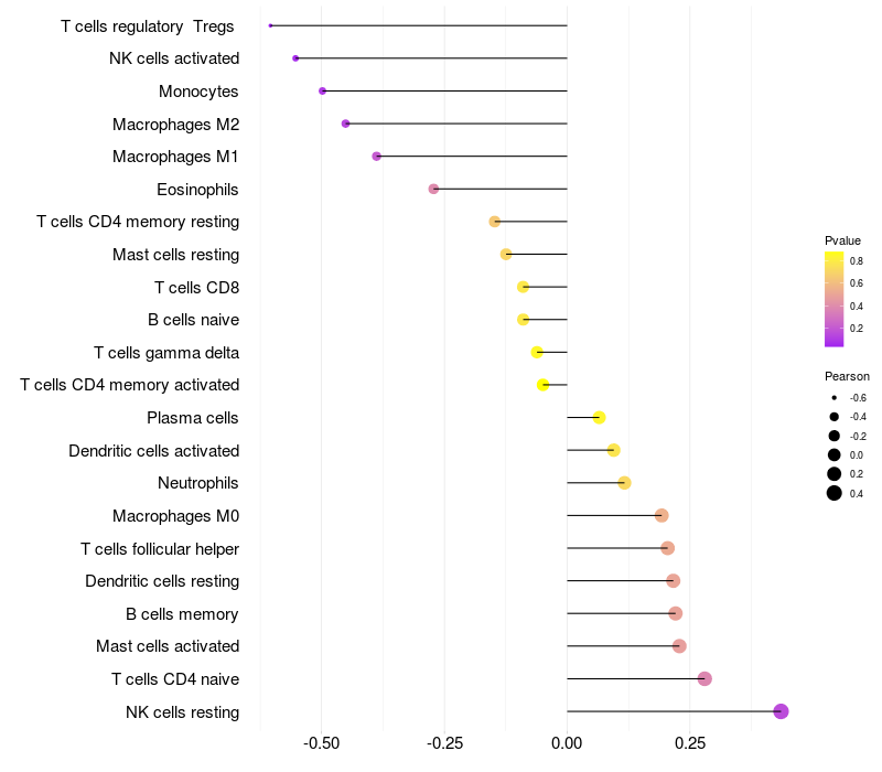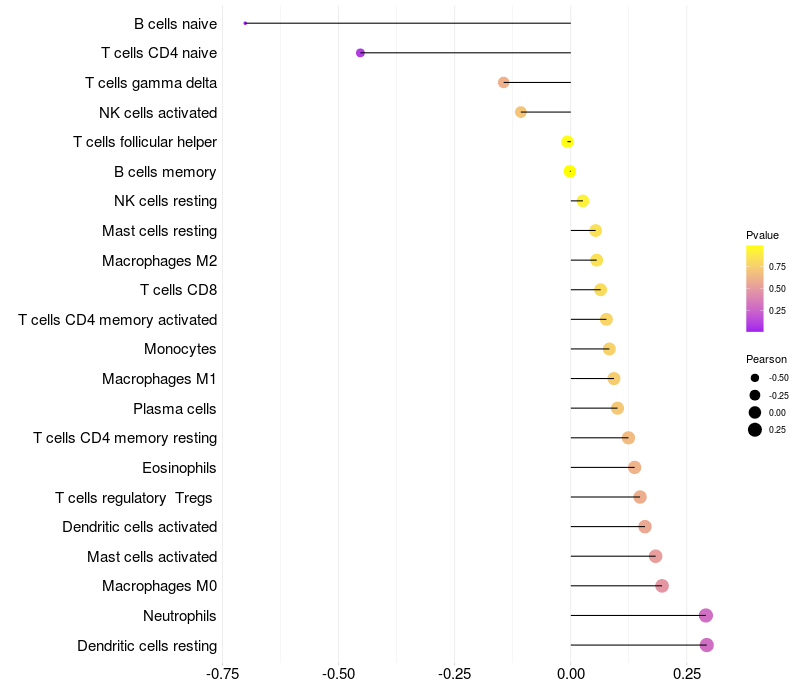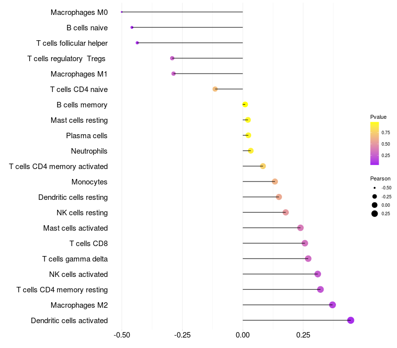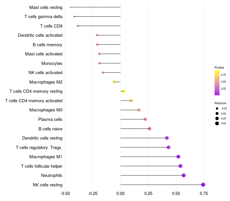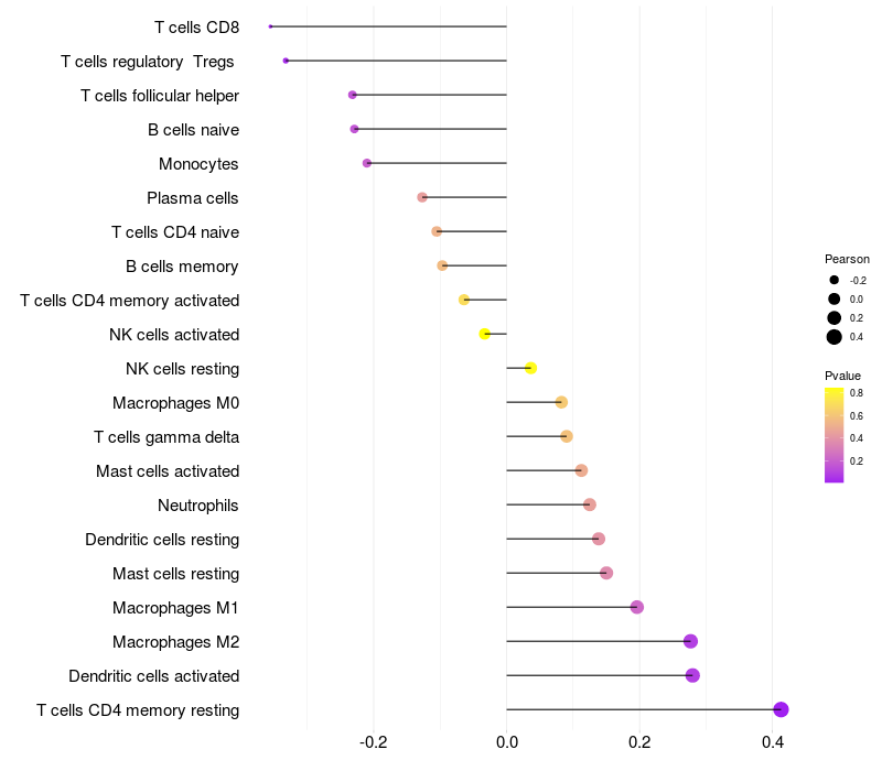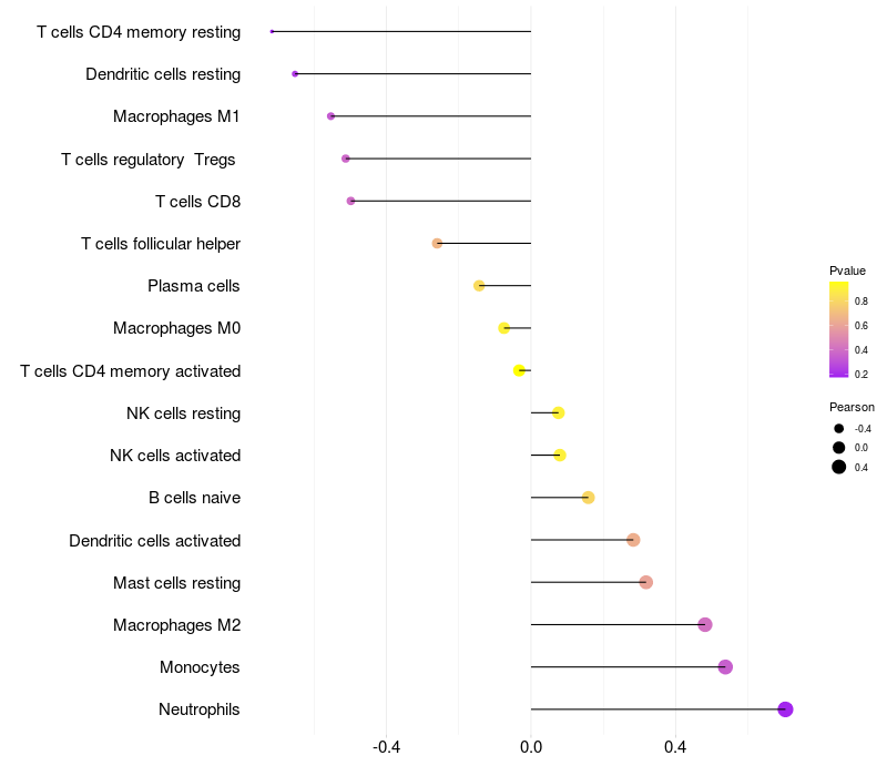 Lollipop of FAM83B expression and immune infiltrating cell level correlation result in HPV+ samples