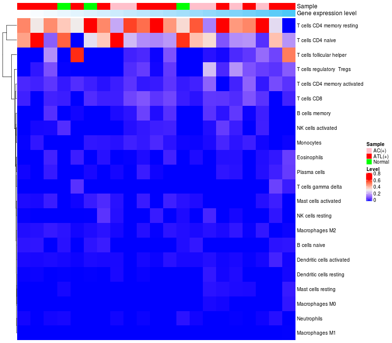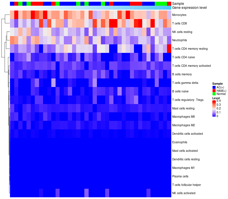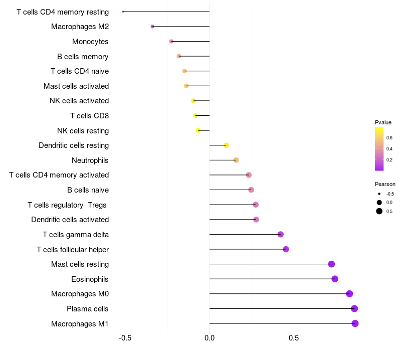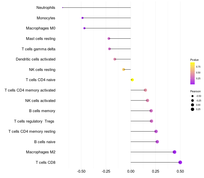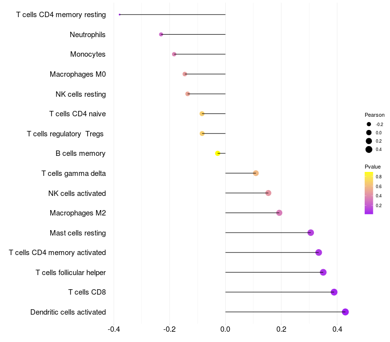 Lollipop of FAM98A expression and immune infiltrating cell level correlation result in HTLV1+ samples