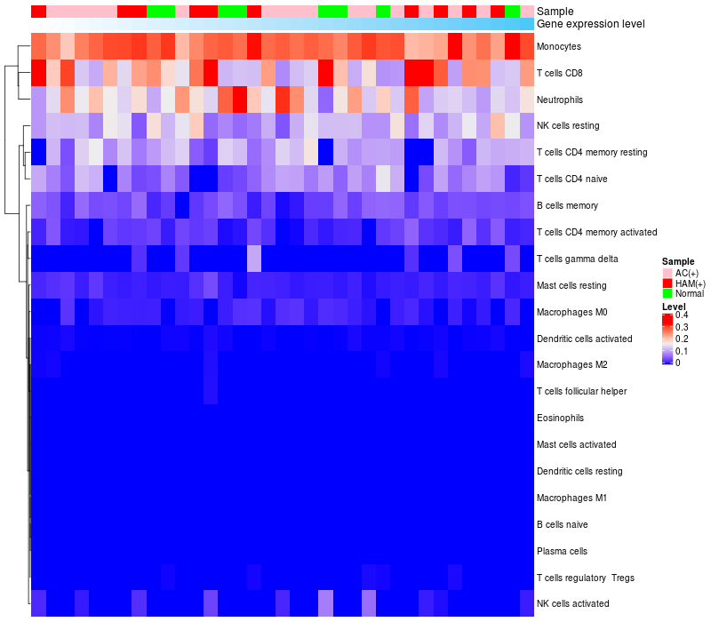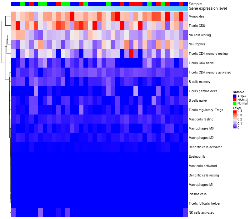 Normal (8), Asymptomatic carriers (HTLV1+)(17), HTLV-1-associated myelopathy (HTLV1+)(10) |